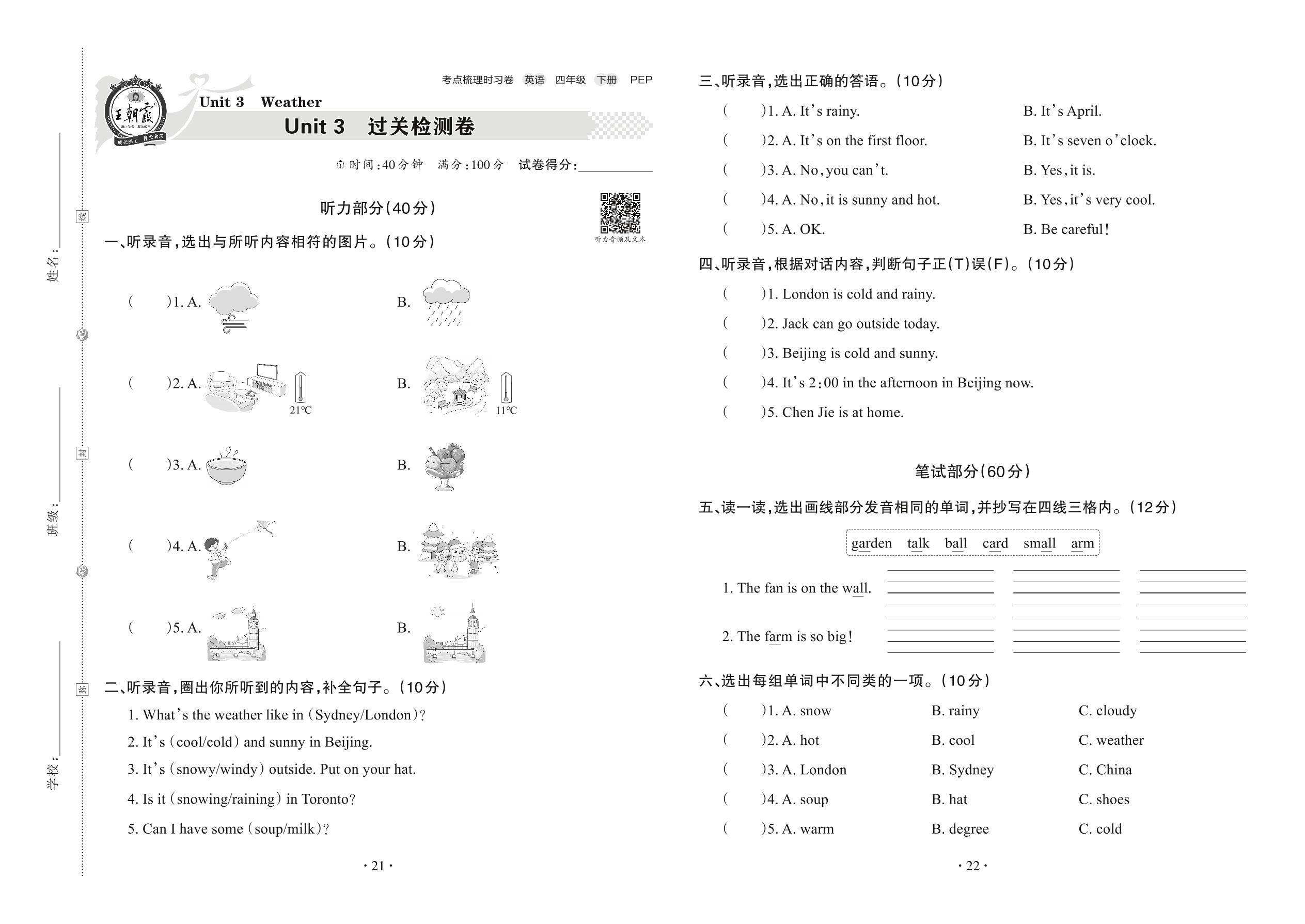 2022下册四年级英语人教PEP版 Unit 3 过关检测卷