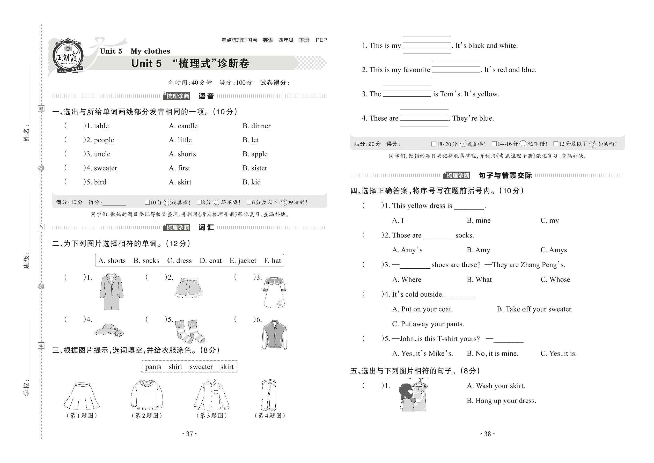 2022下册四年级英语人教PEP版 Unit 5 “梳理式”诊断卷