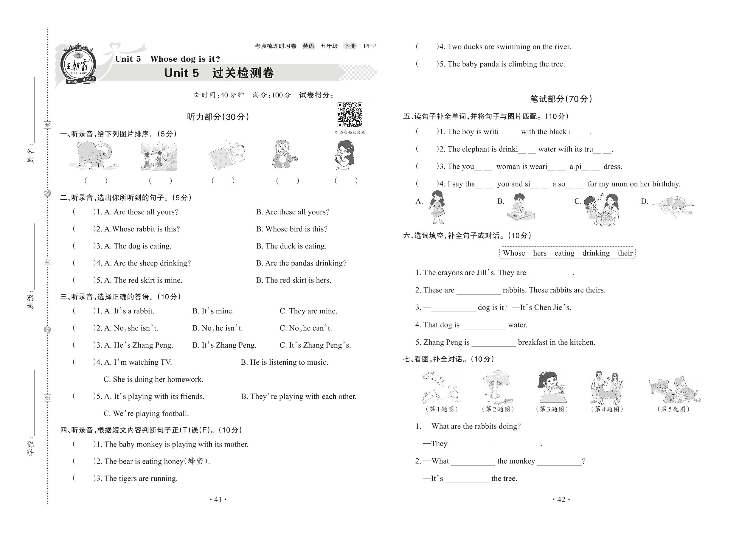 五年级英语人教PEP版(三起始)下册单元卷