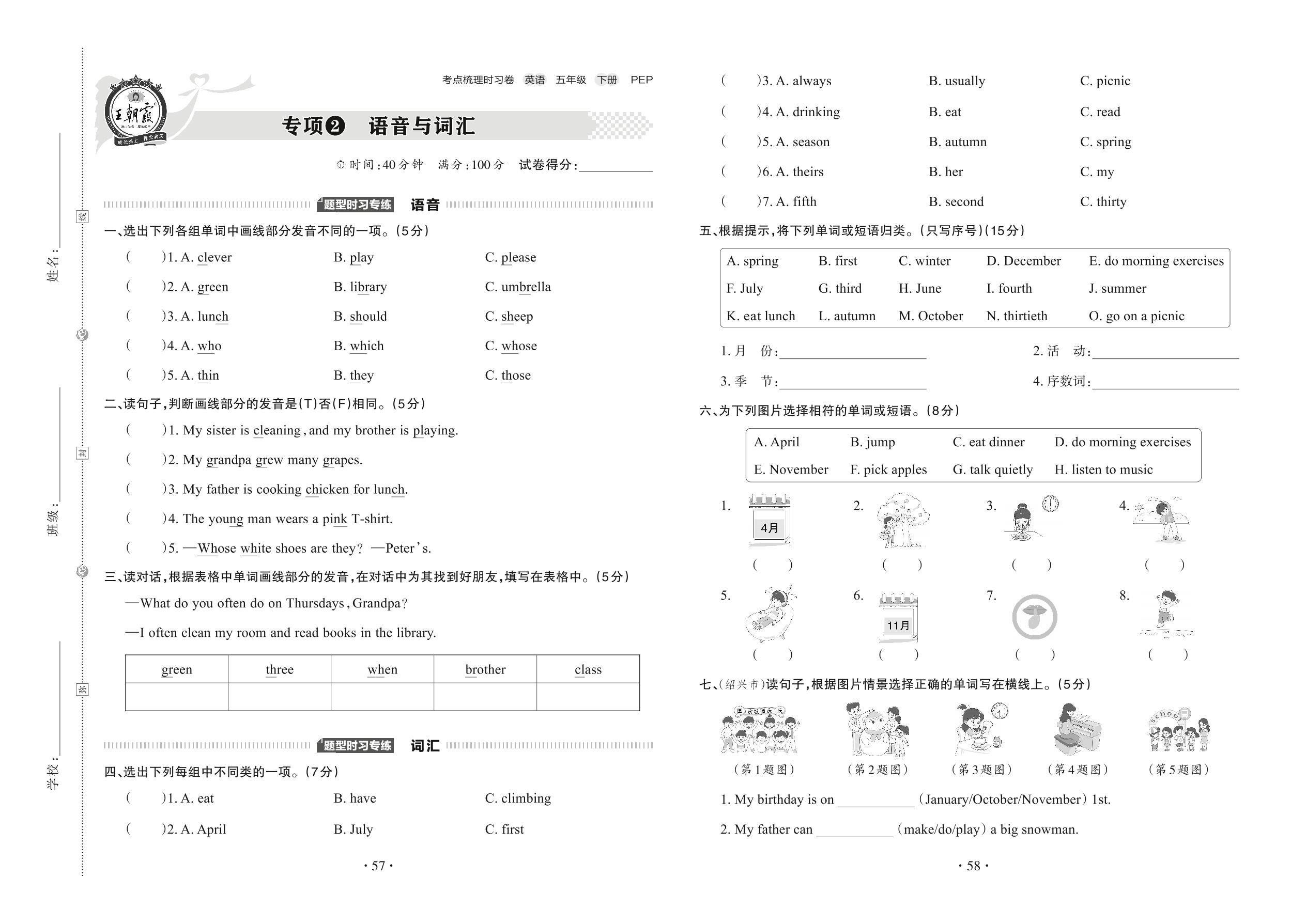 2022下册五年级英语人教PEP版 专项2 语音与词汇