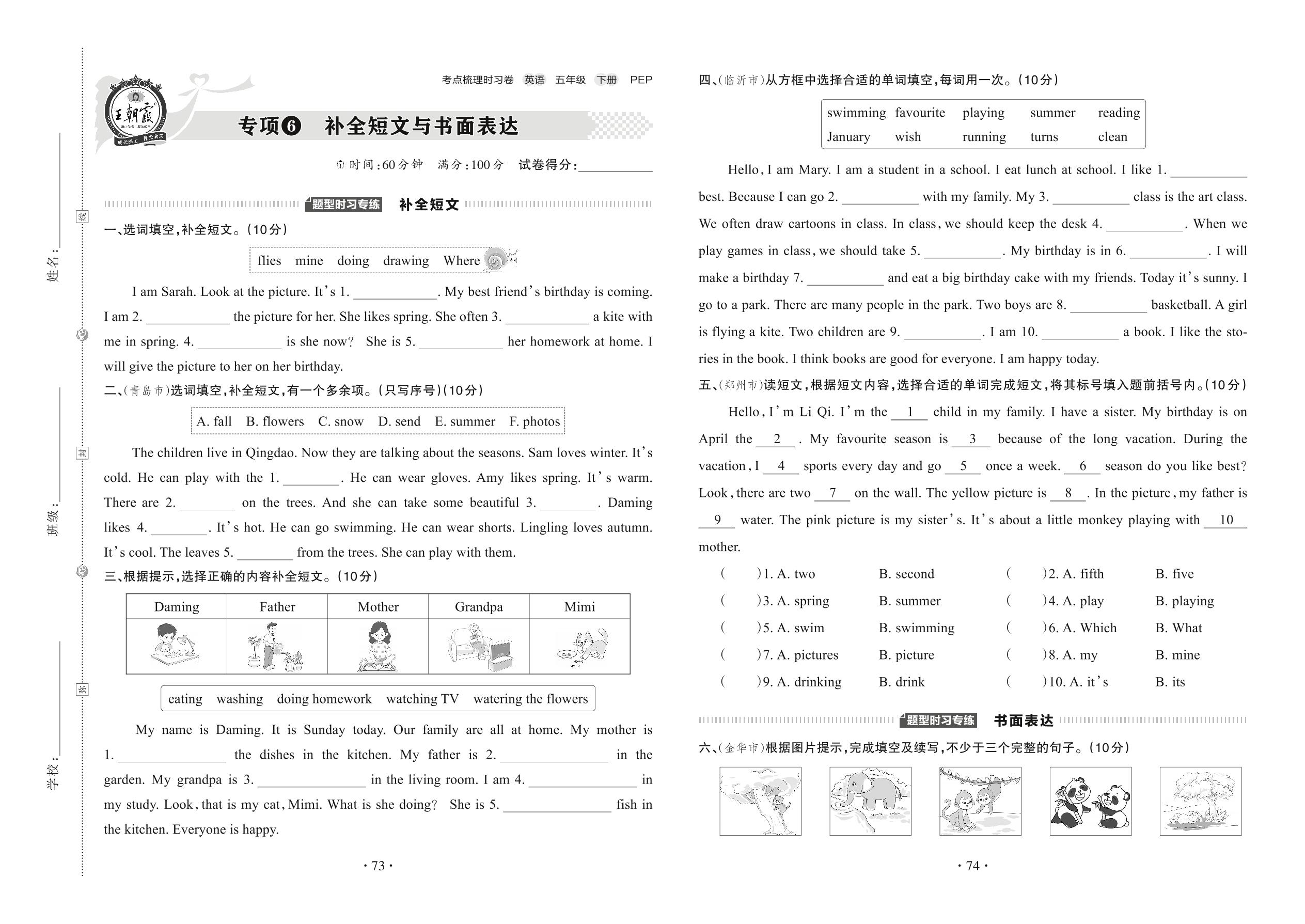 2022下册五年级英语人教PEP版 专项6 补全短文与书面表达