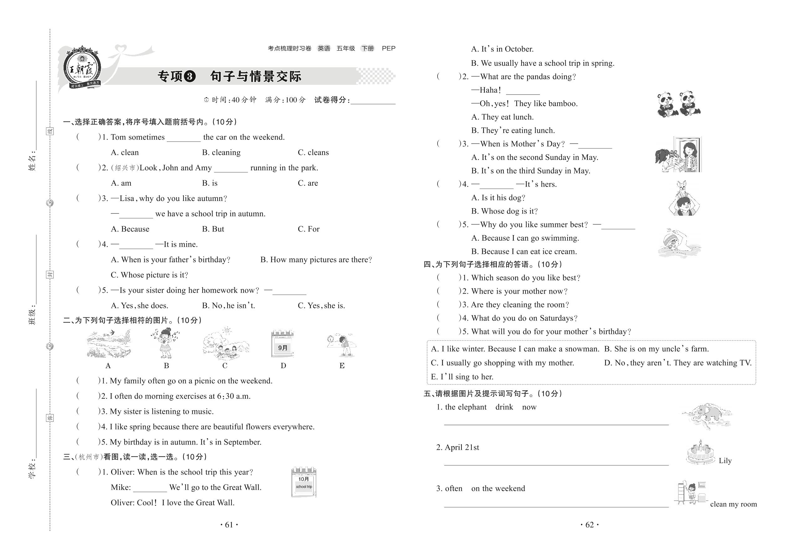 2022下册五年级英语人教PEP版 专项3 句子与情景交际