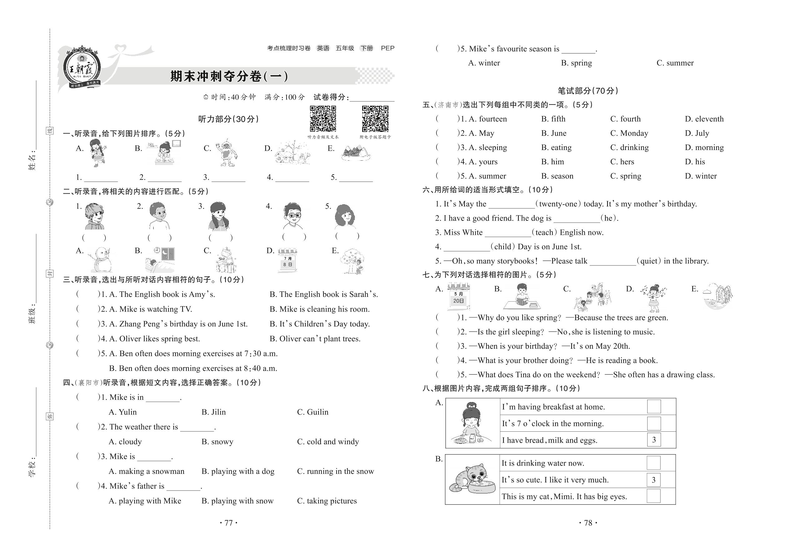 2022下册五年级英语人教PEP版 期末冲刺夺分卷(一)