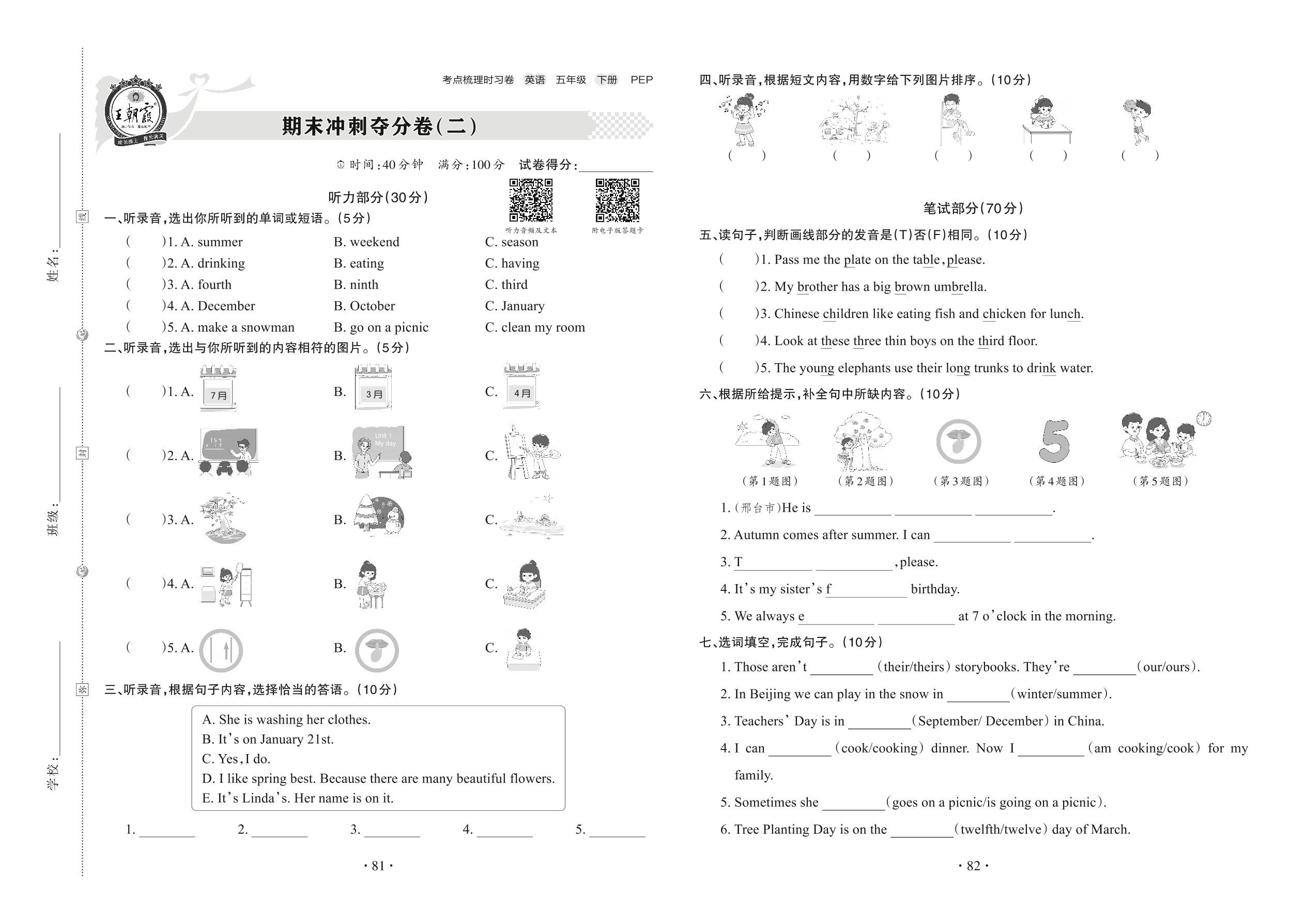 五年级英语人教PEP版(三起始)下册期末卷