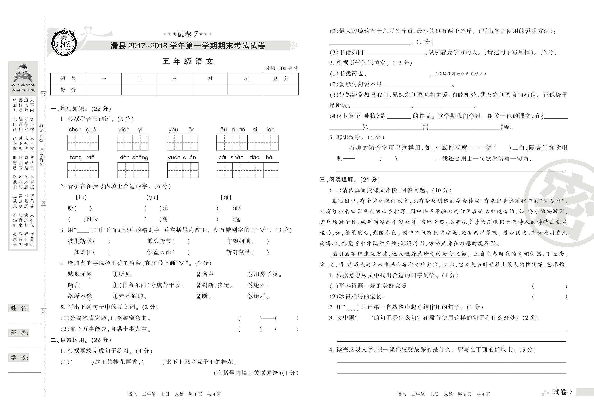 2017-2018学年第一学期安阳市滑县五年级语文试卷(人教版)【7】