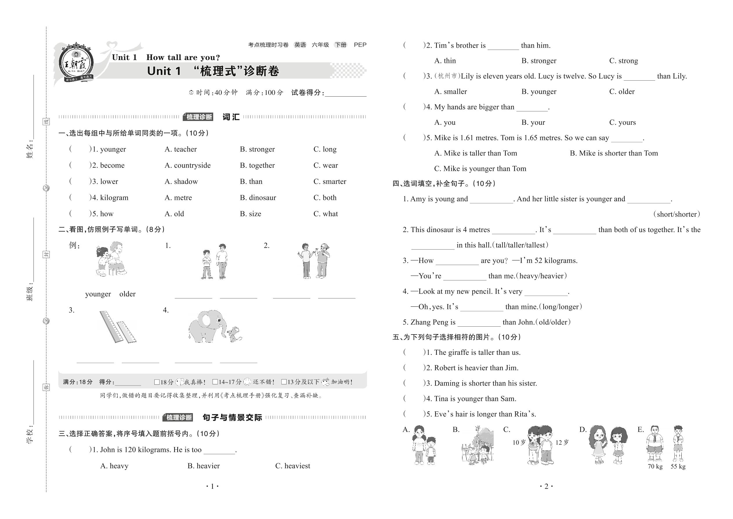 2022下册六年级英语人教PEP版 Unit 1 “梳理式”诊断卷