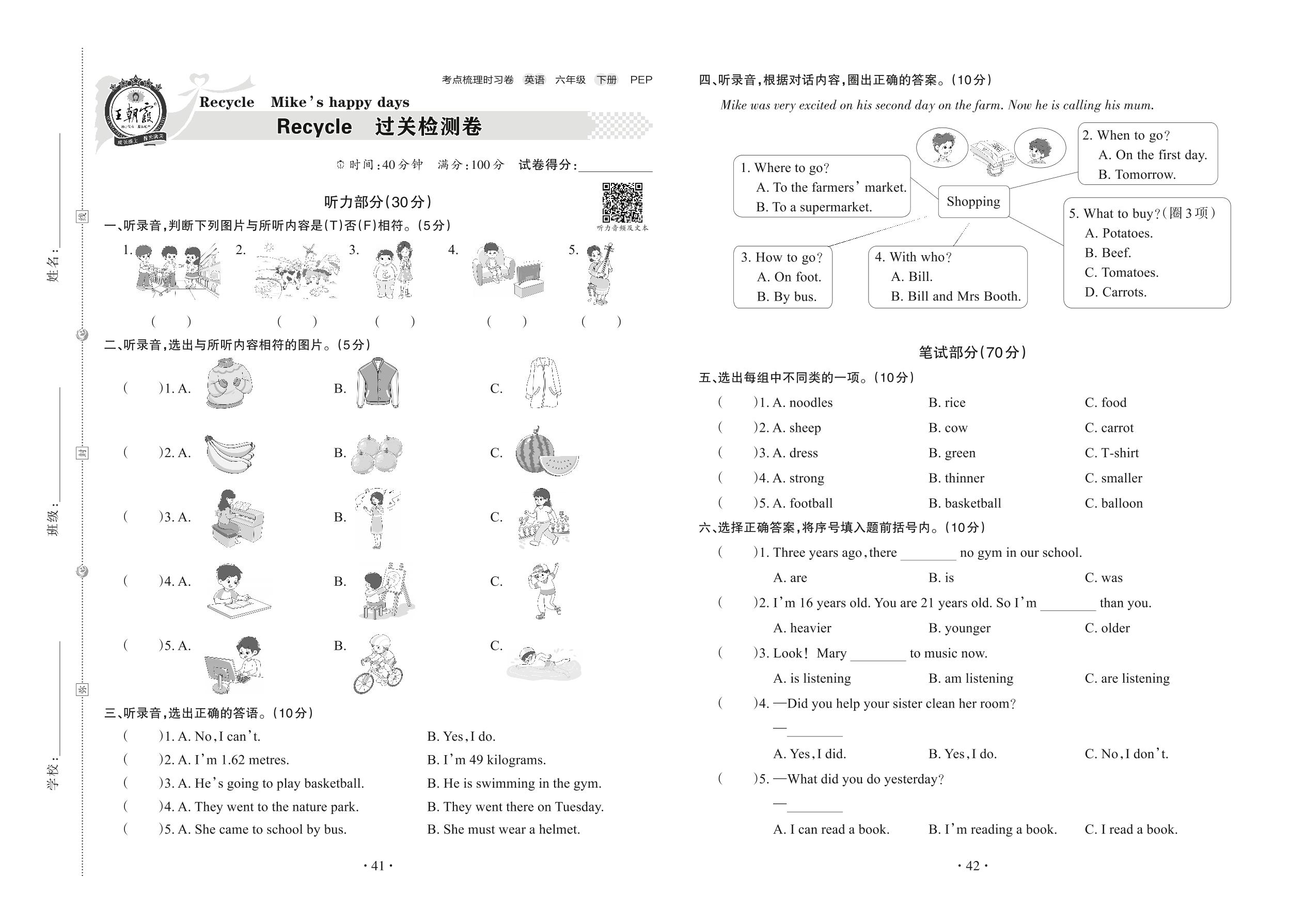 2022下册六年级英语人教PEP版 Recycle 过关检测卷