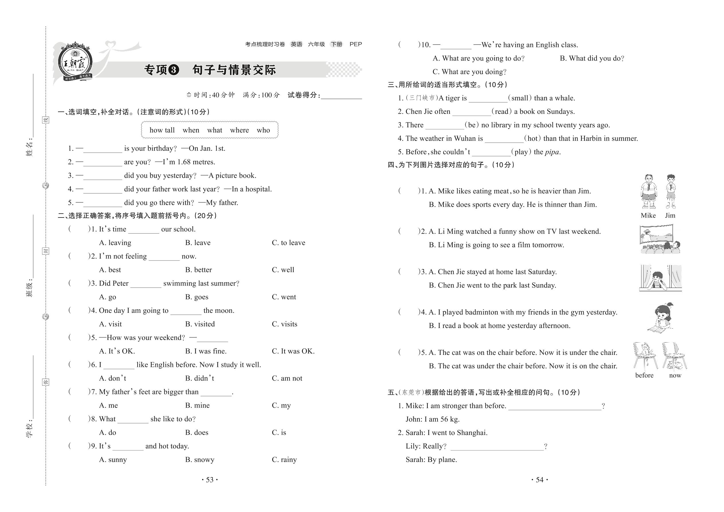 2022下册六年级英语人教PEP版 专项3 句子与情景交际