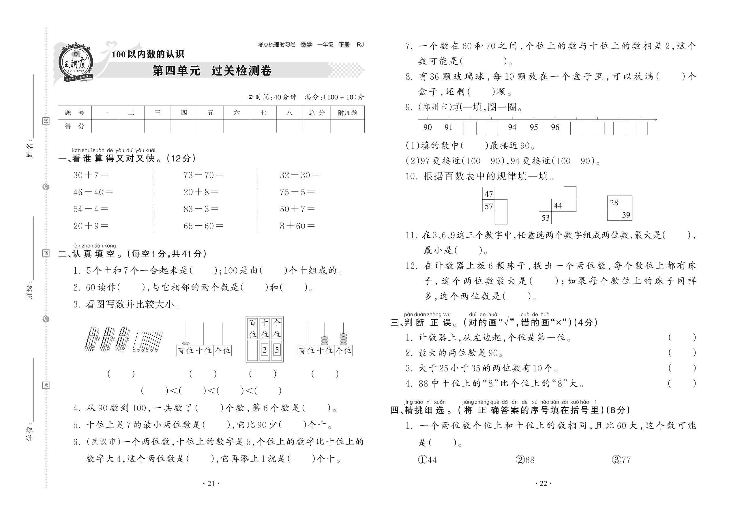 2022下册一年级数学人教版 第四单元 过关检测卷