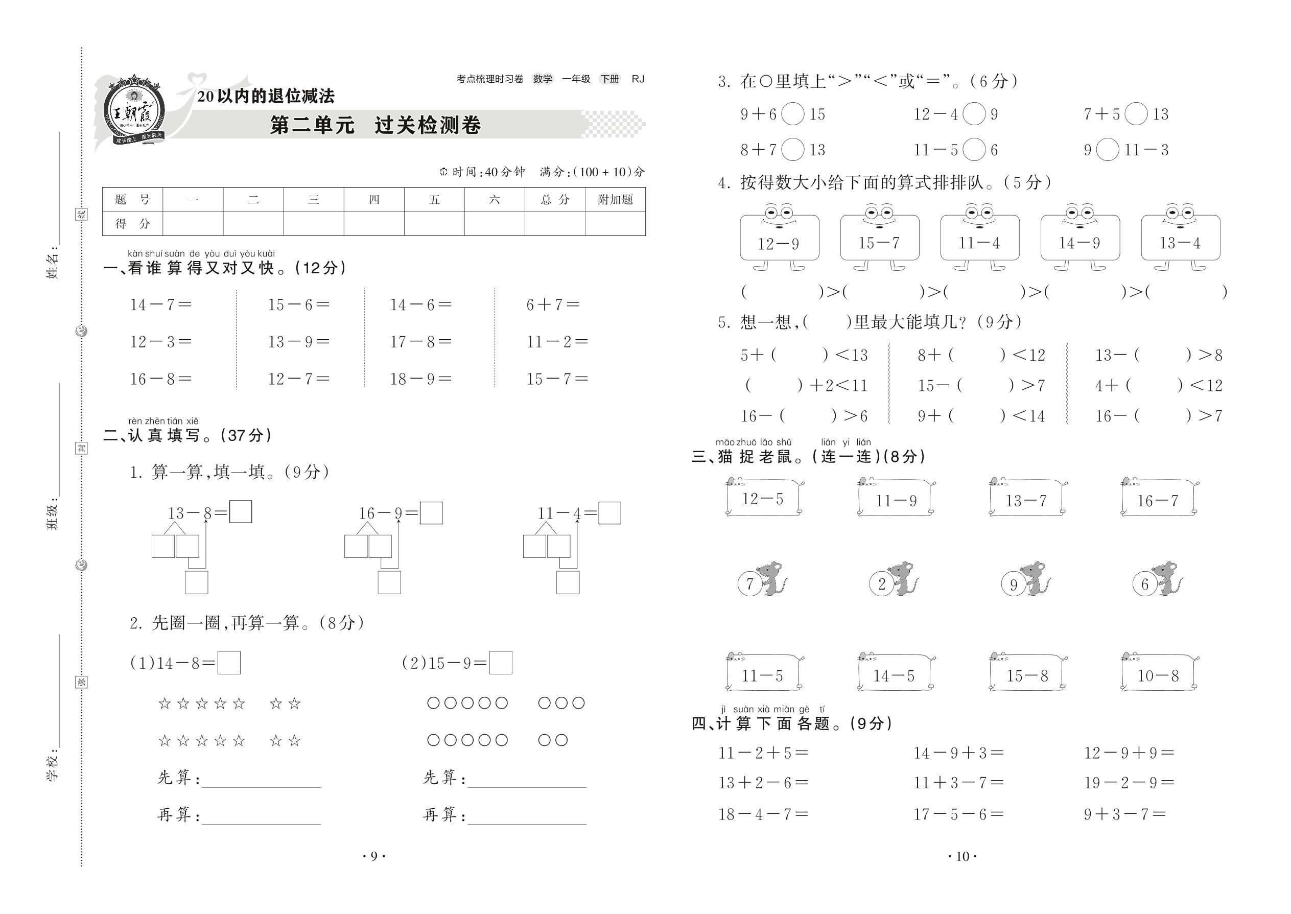 2022下册一年级数学人教版 第二单元 过关检测卷