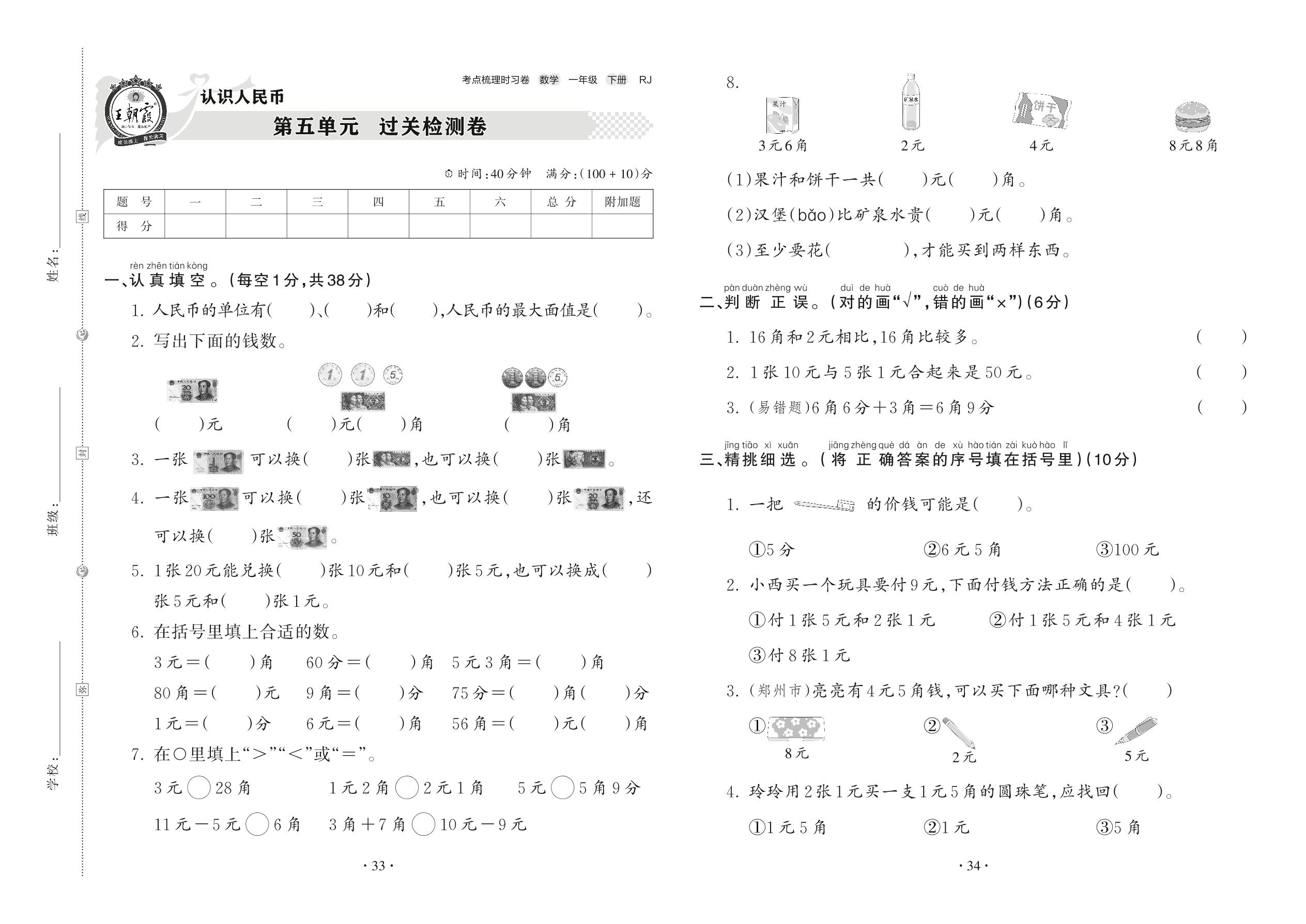 2022下册一年级数学人教版 第五单元 过关检测卷