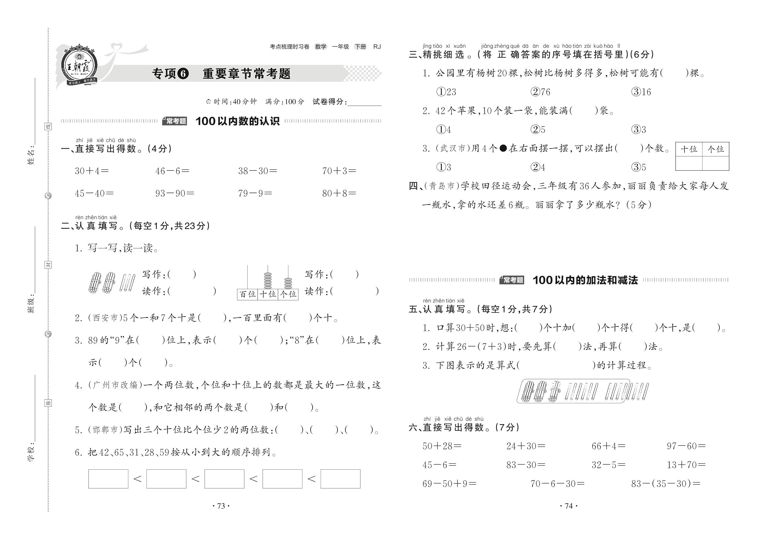 一年级数学人教版下册专项卷