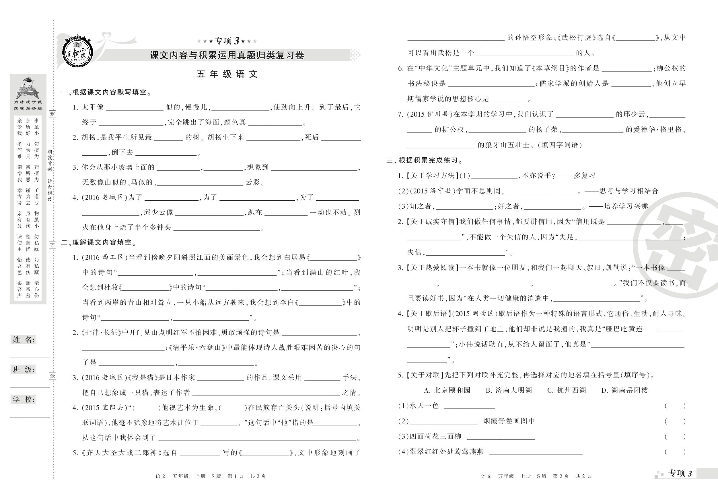 王朝霞期末专项卷——课文内容与积累运用、课内阅读与写作真题归类复习五年级上册语文(S版)_R210801224758【0】