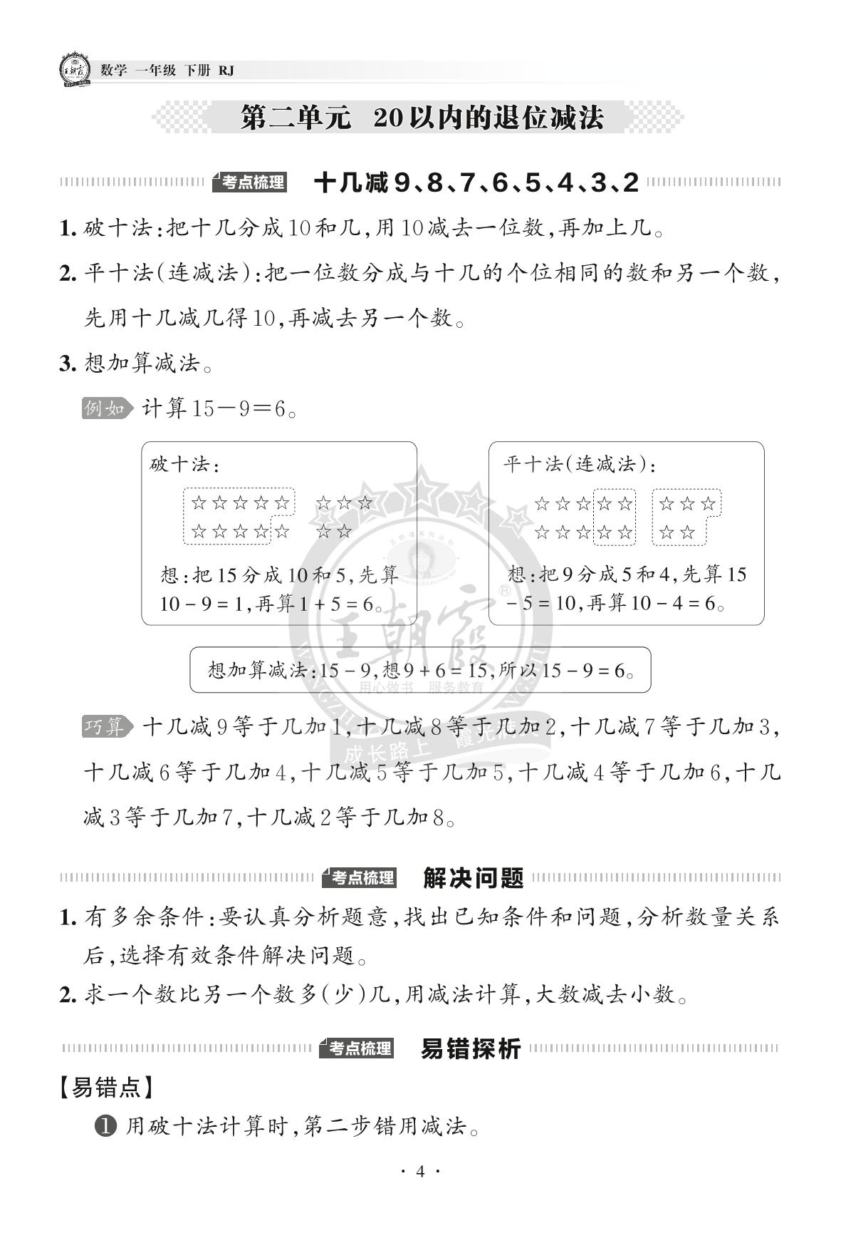 2022下册一年级数学人教版 考点梳理手册——第二单元 20以内的退位减法