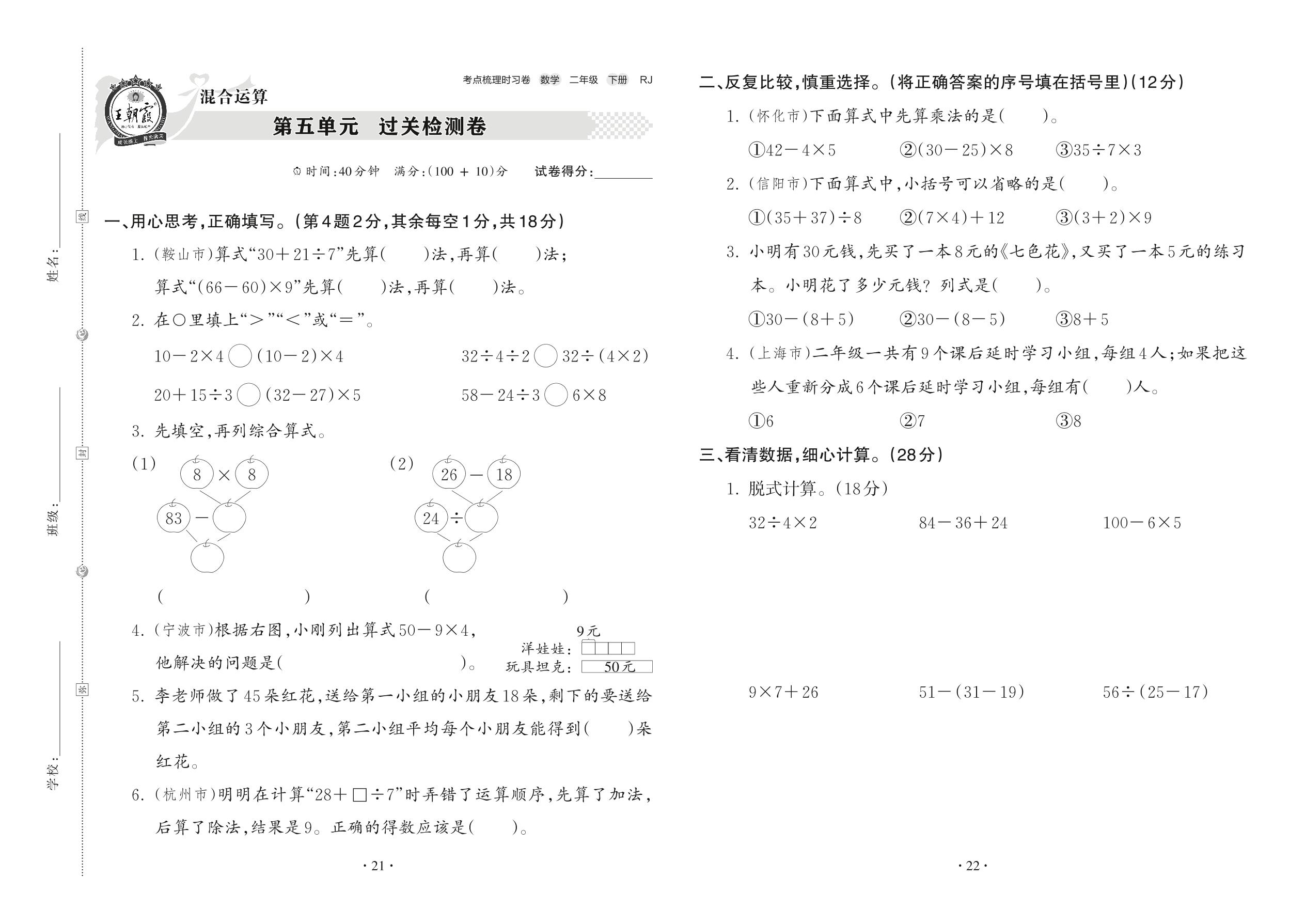 2022下册二年级数学人教版 第五单元 过关检测卷
