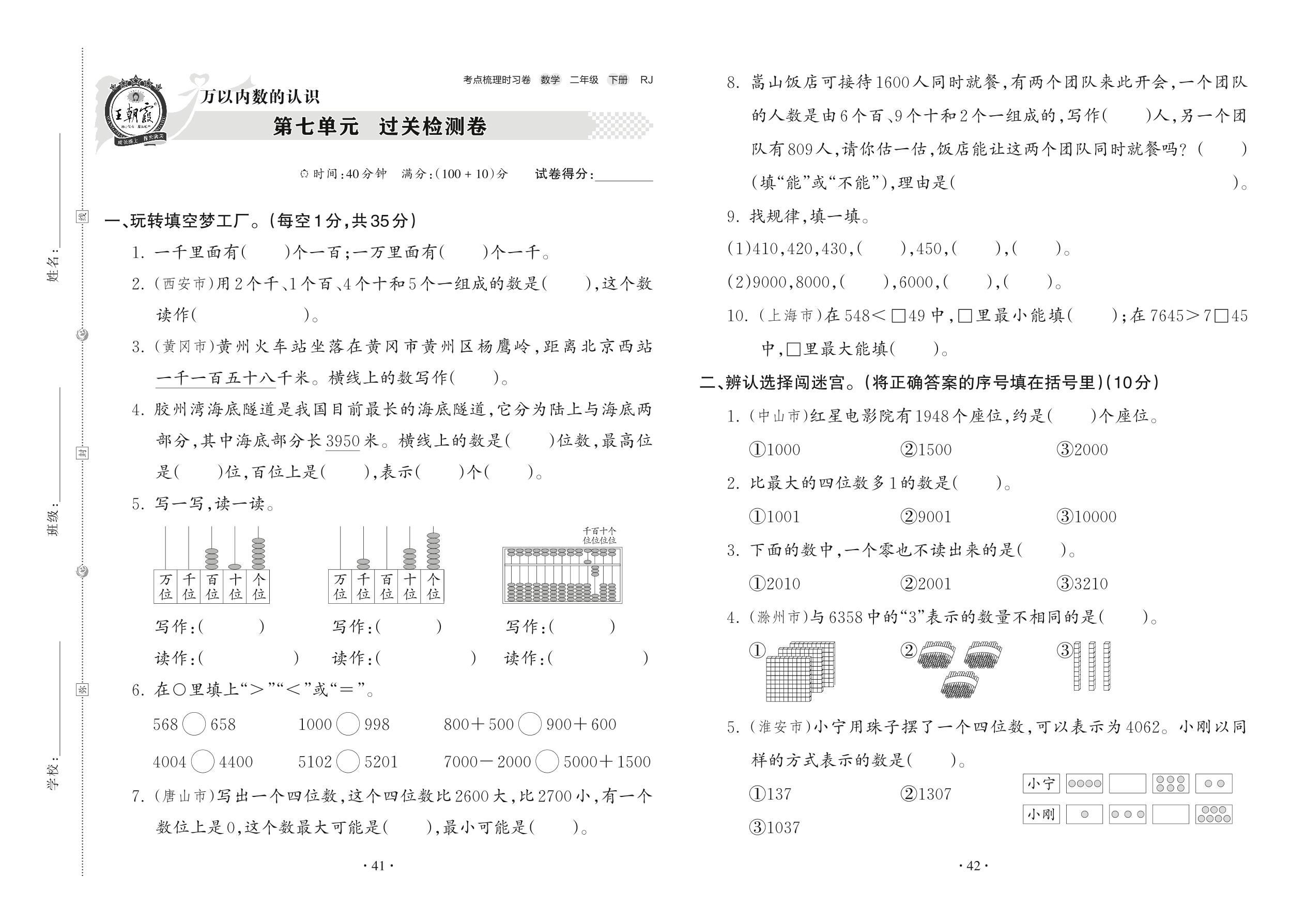 2022下册二年级数学人教版 第七单元 过关检测卷