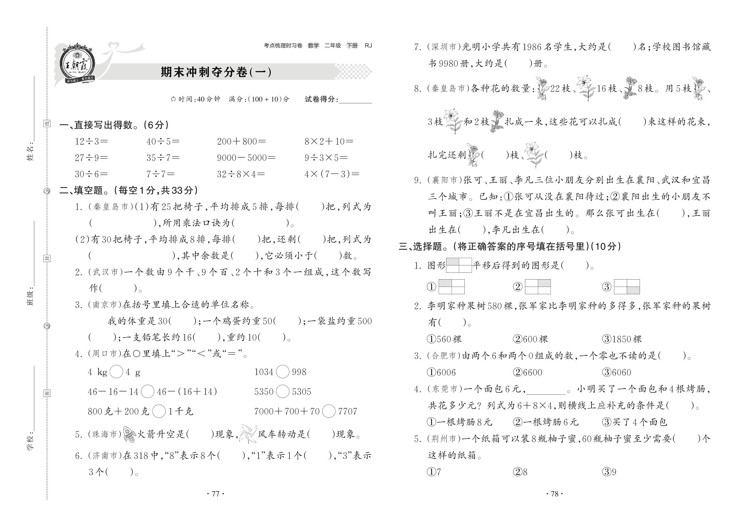 2022下册二年级数学人教版 期末冲刺夺分卷(一)