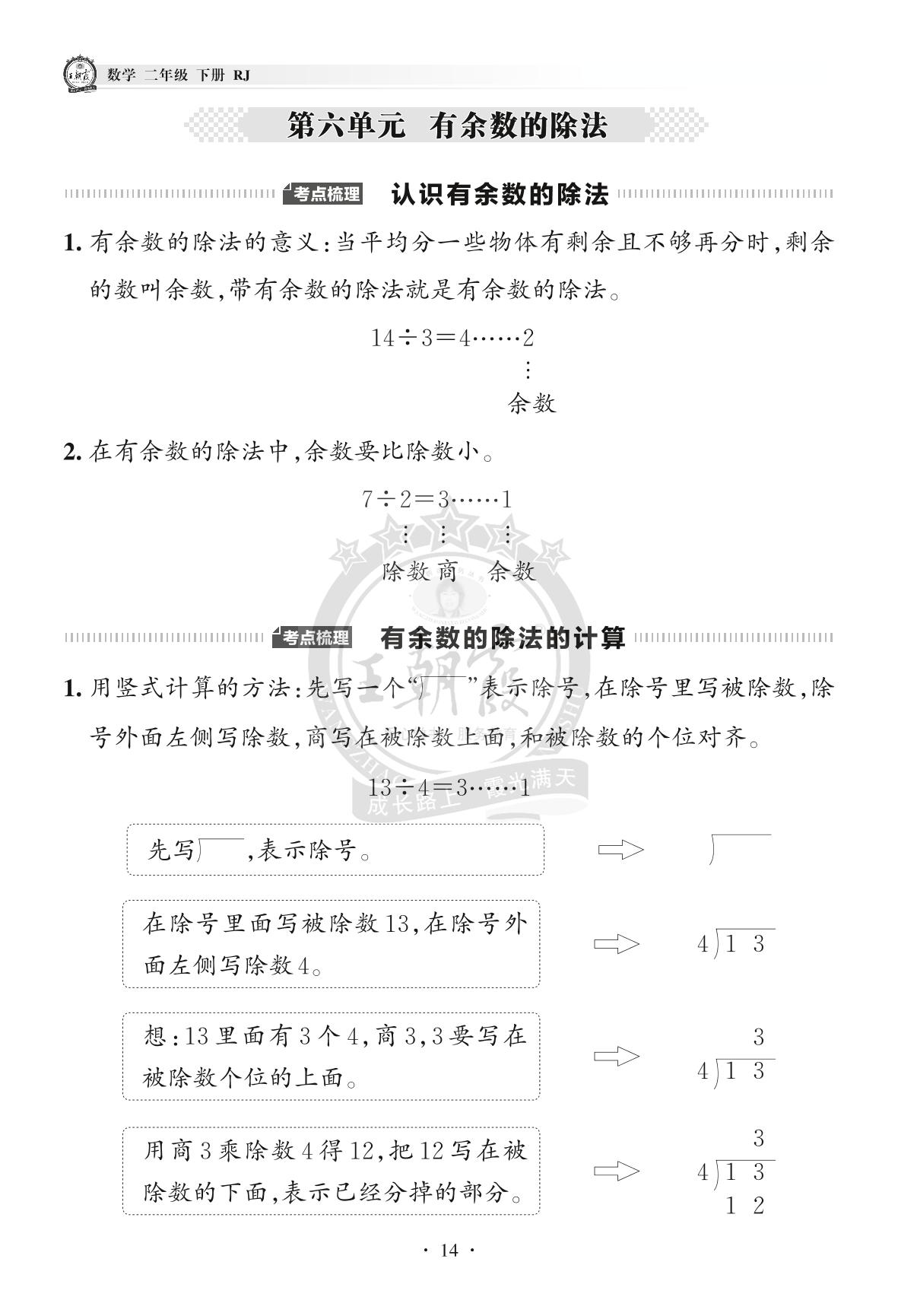 2022下册二年级数学人教版 考点梳理手册——第六单元 有余数的除法