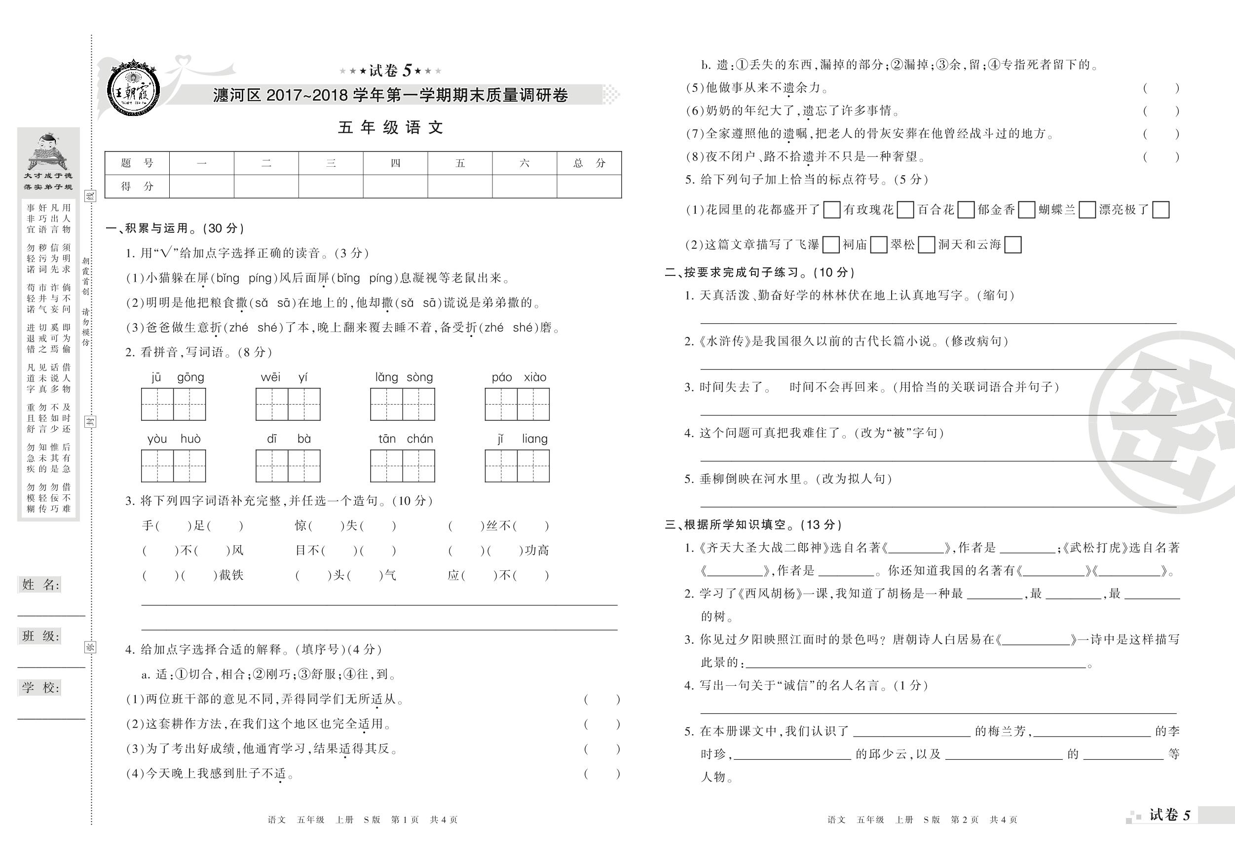 2017-2018学年第一学期洛阳市瀍河区五年级语文试卷(S版)【5】