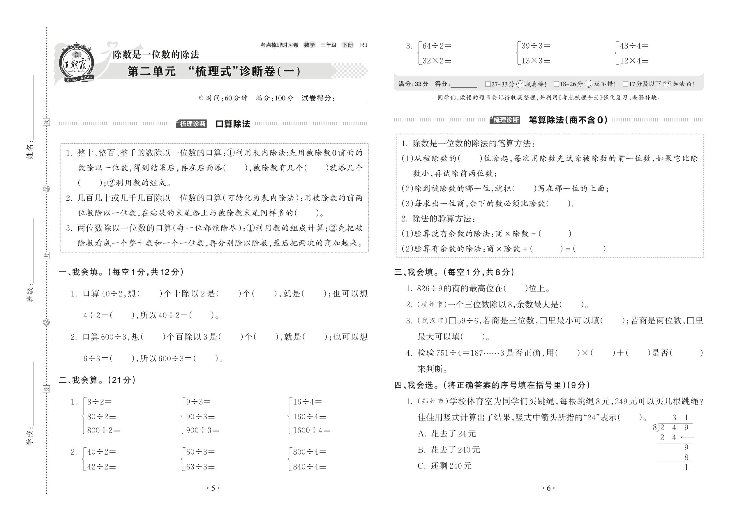 2022下册三年级数学人教版 第二单元 “梳理式”诊断卷(一)