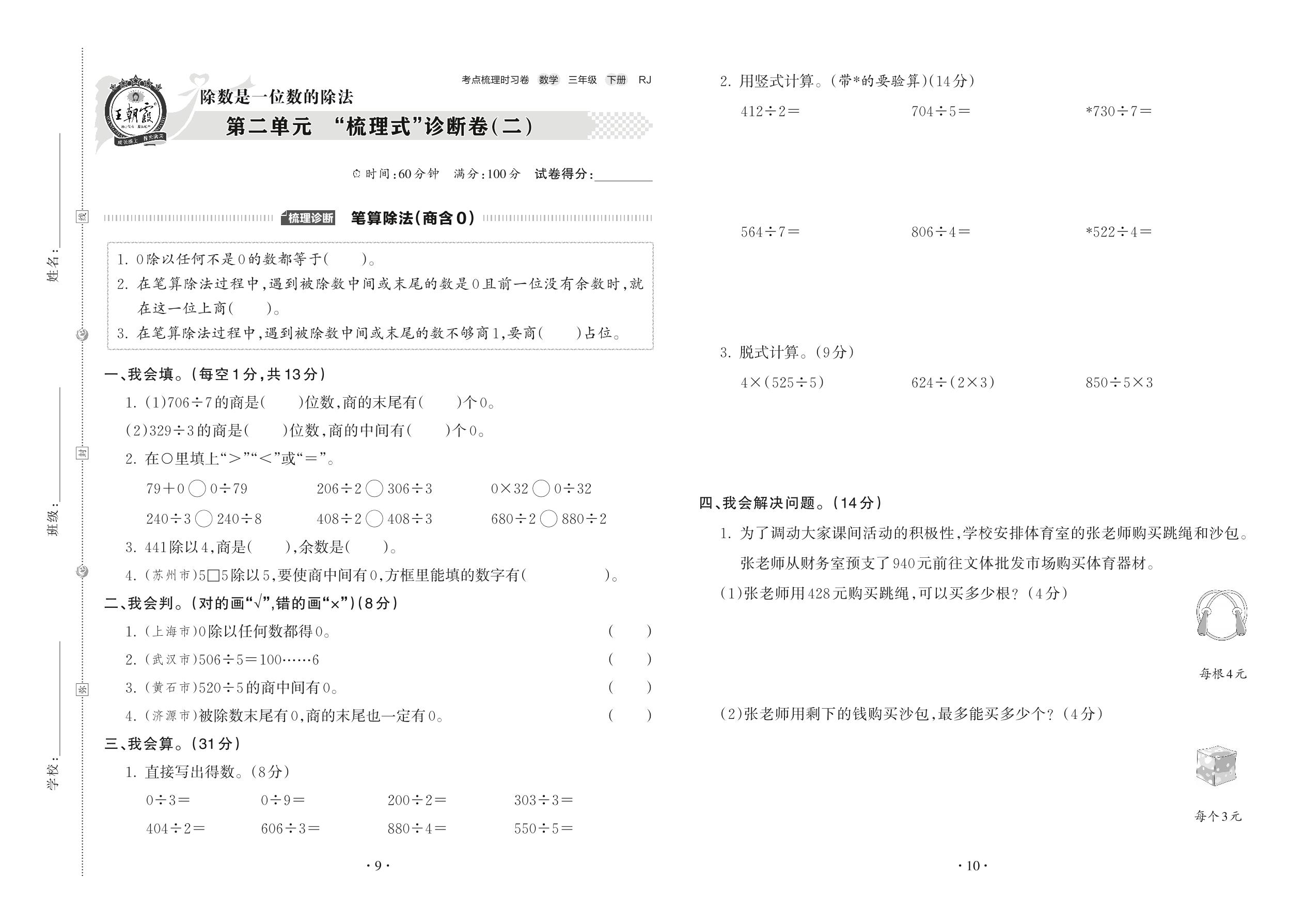 2022下册三年级数学人教版 第二单元 “梳理式”诊断卷(二)