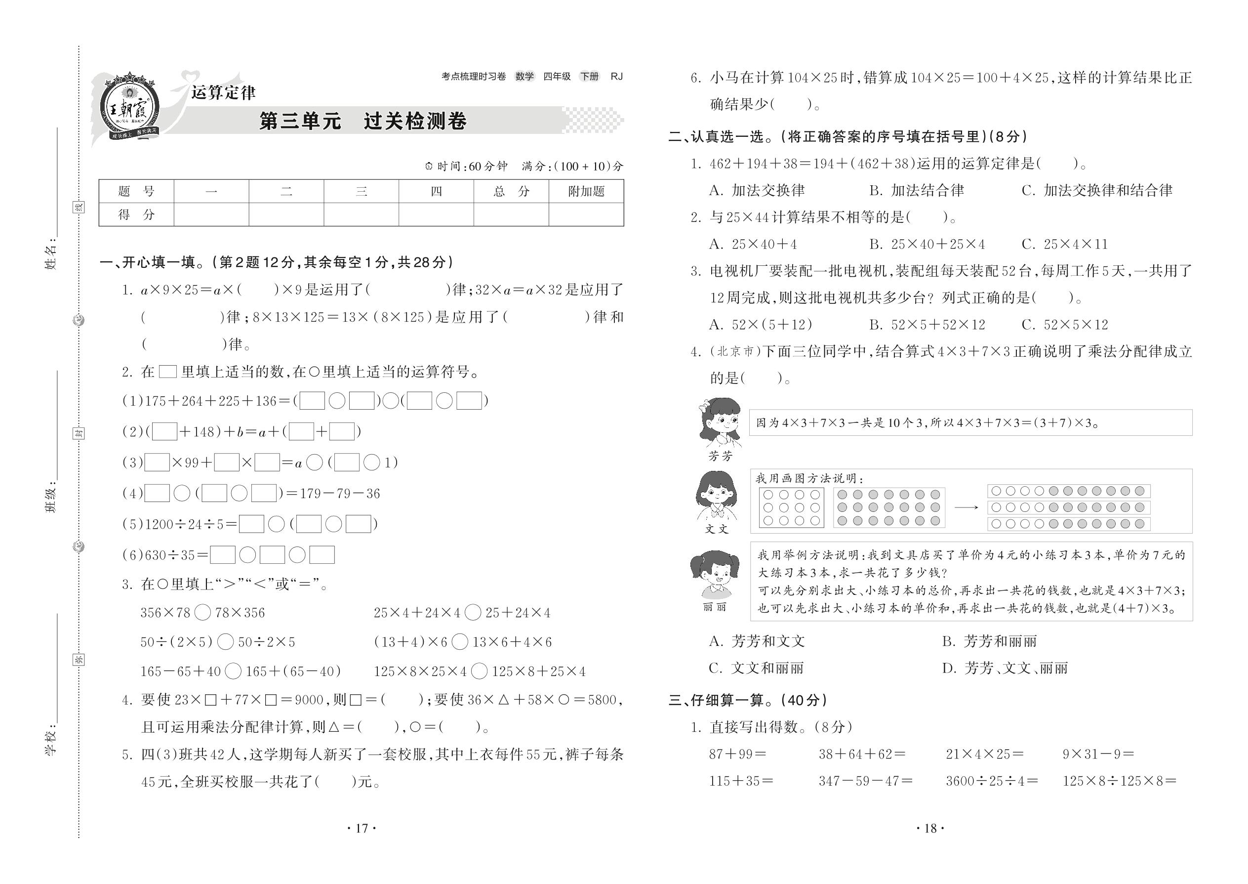 2022下册四年级数学人教版 第三单元 过关检测卷