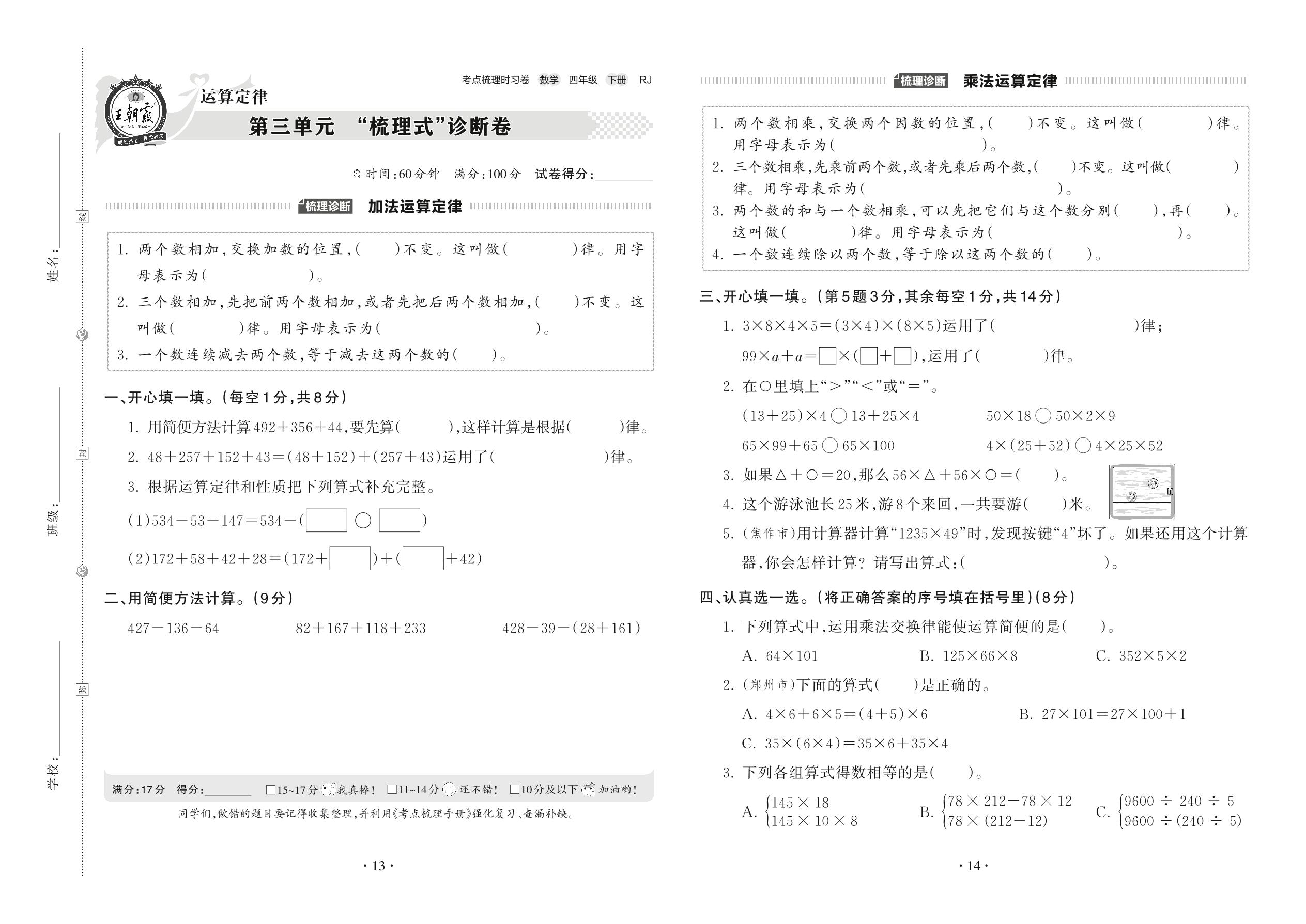 2022下册四年级数学人教版 第三单元 “梳理式”诊断卷