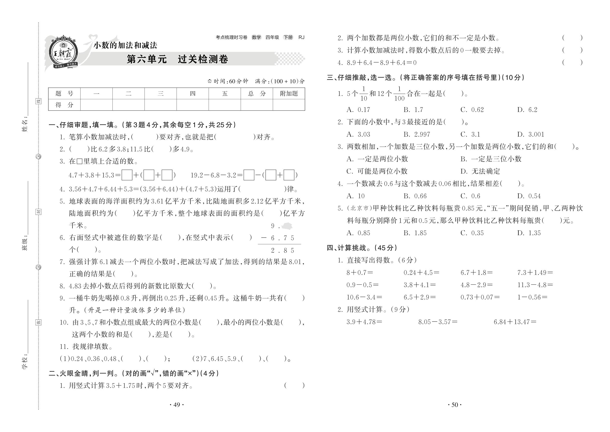 2022下册四年级数学人教版 第六单元 过关检测卷
