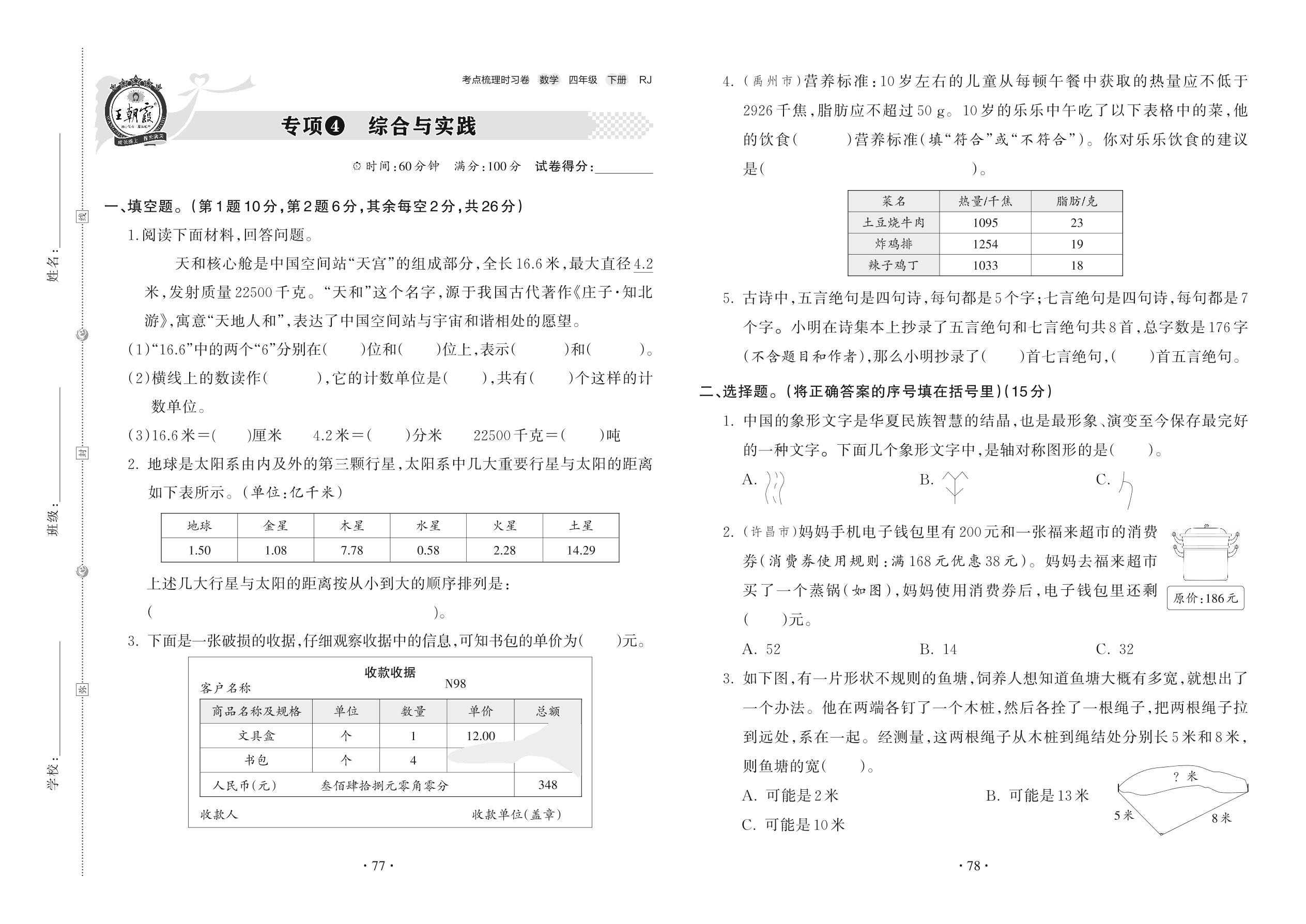 2022下册四年级数学人教版 专项4 综合与实践
