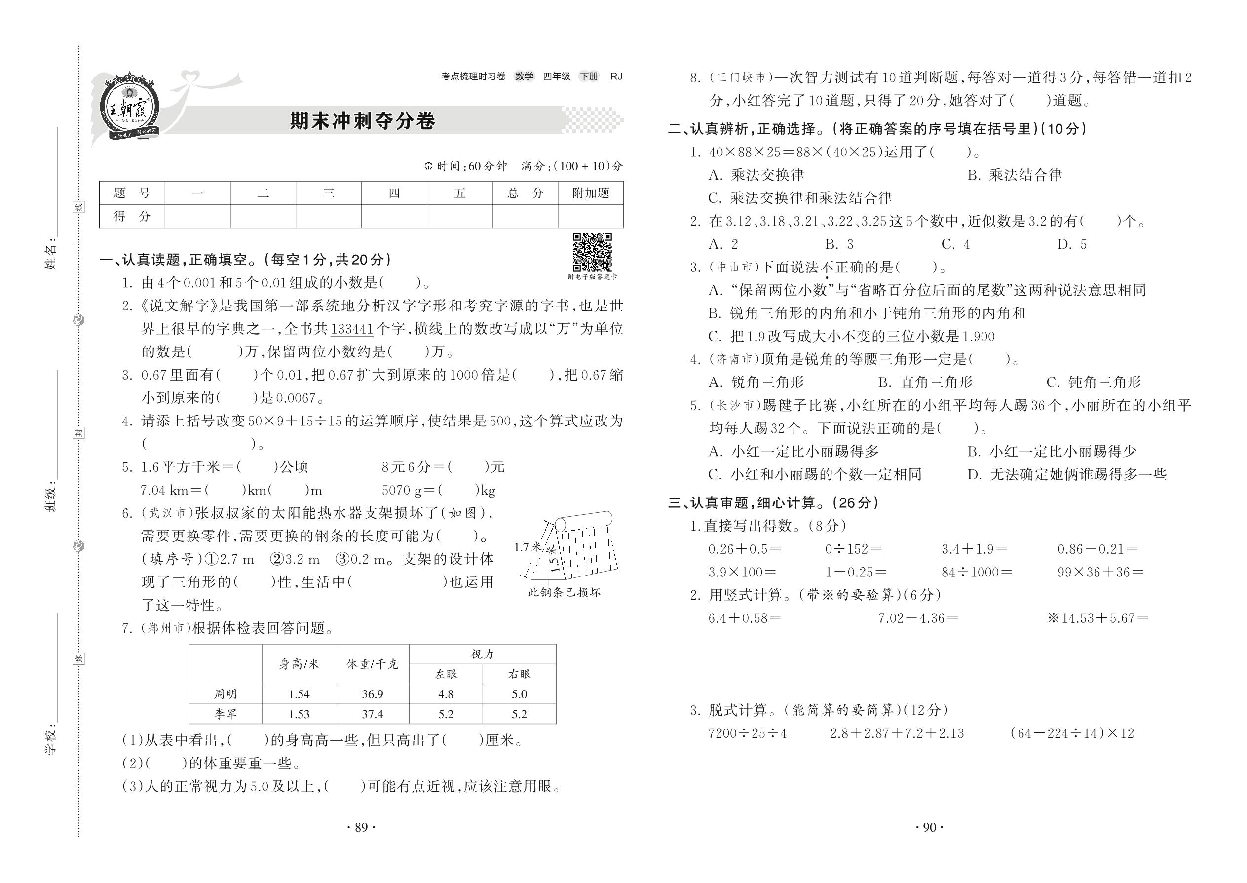 2022下册四年级数学人教版 期末冲刺夺分卷