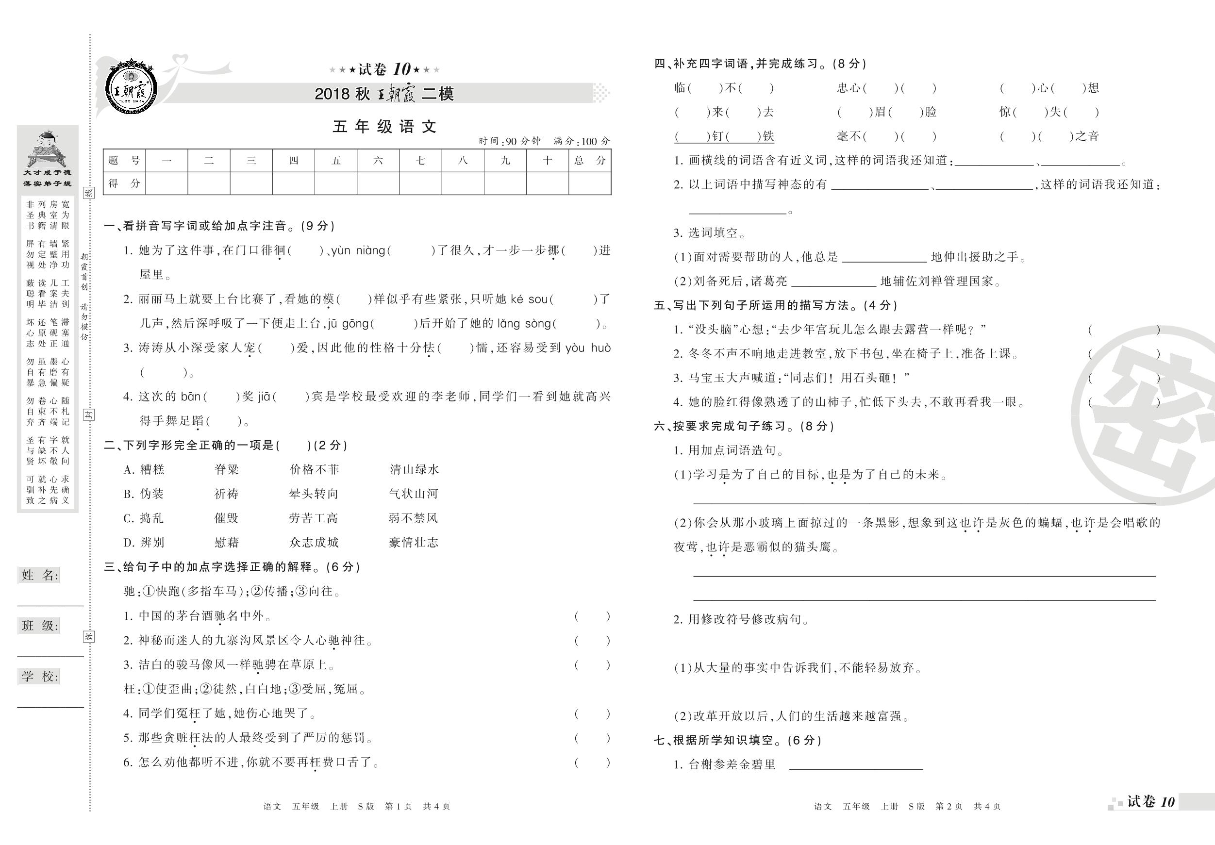 王朝霞期末模拟卷五年级上册语文(S版)_R210801224830【10】