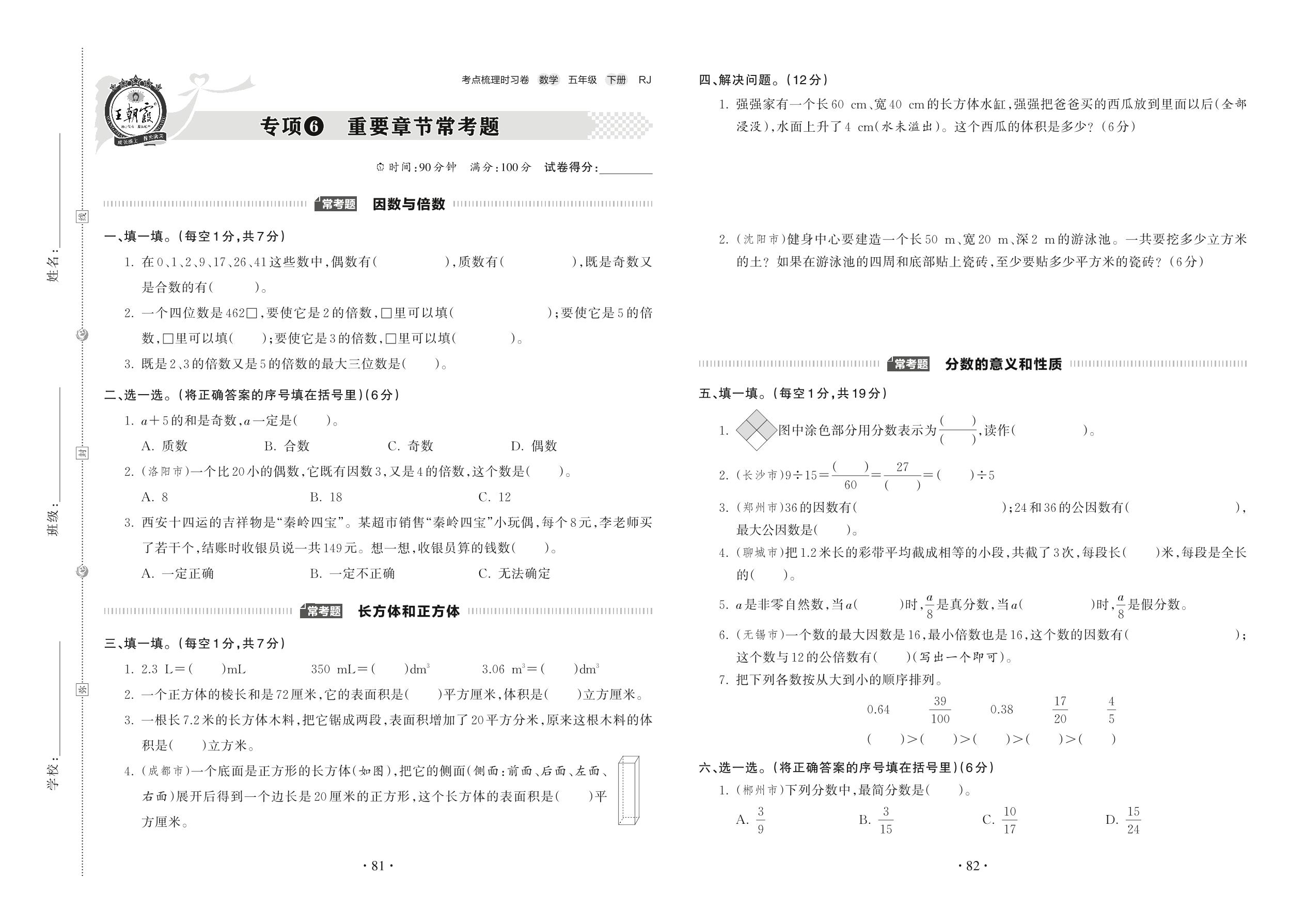 2022下册五年级数学人教版 专项6 重要章节常考题