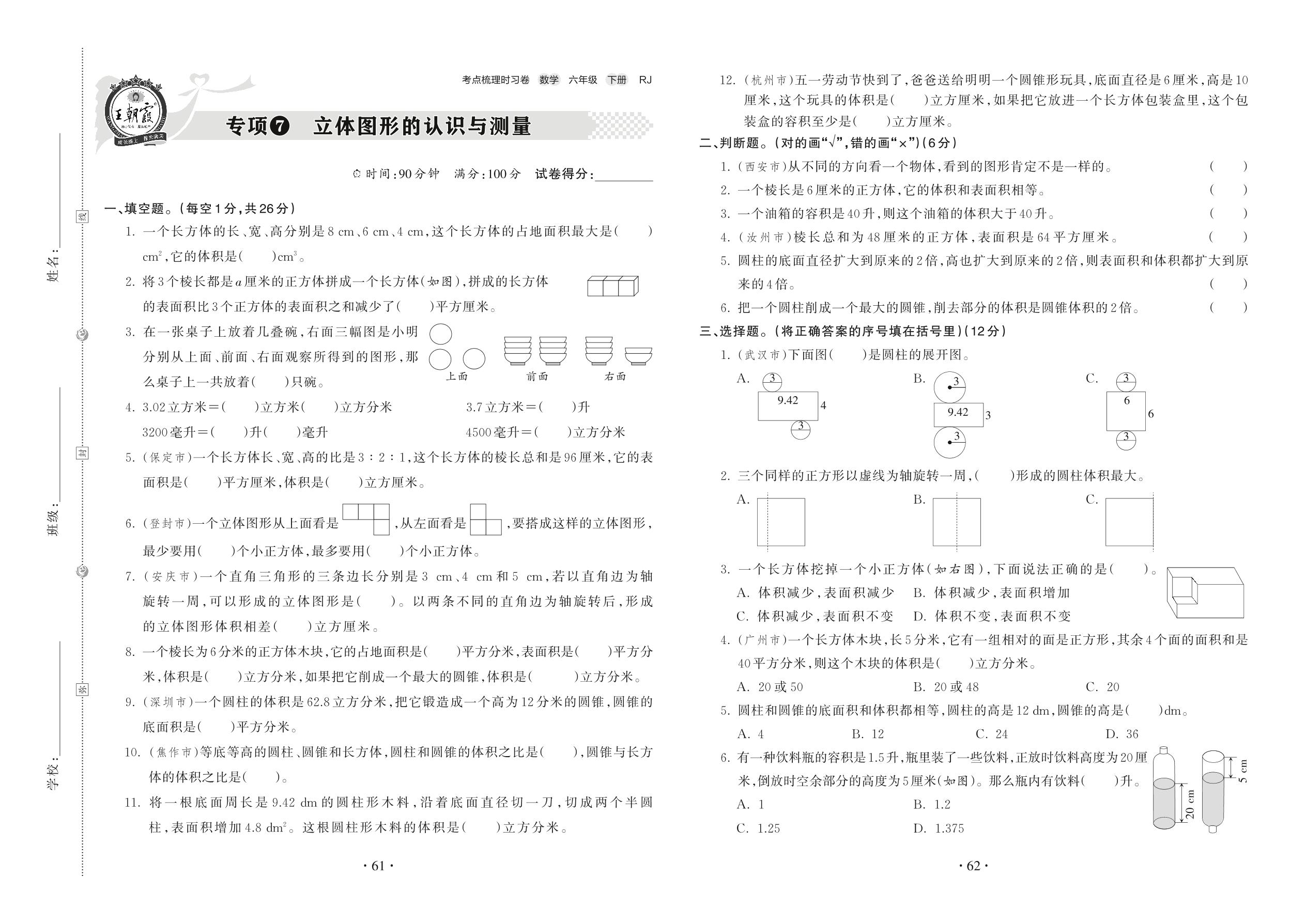 2022下册六年级数学人教版 专项7 立体图形的认识与测量