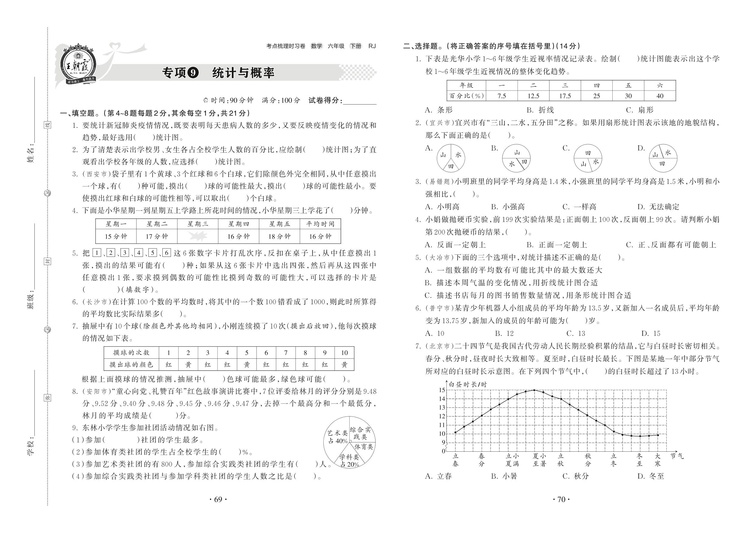 2022下册六年级数学人教版 专项9 统计与概率