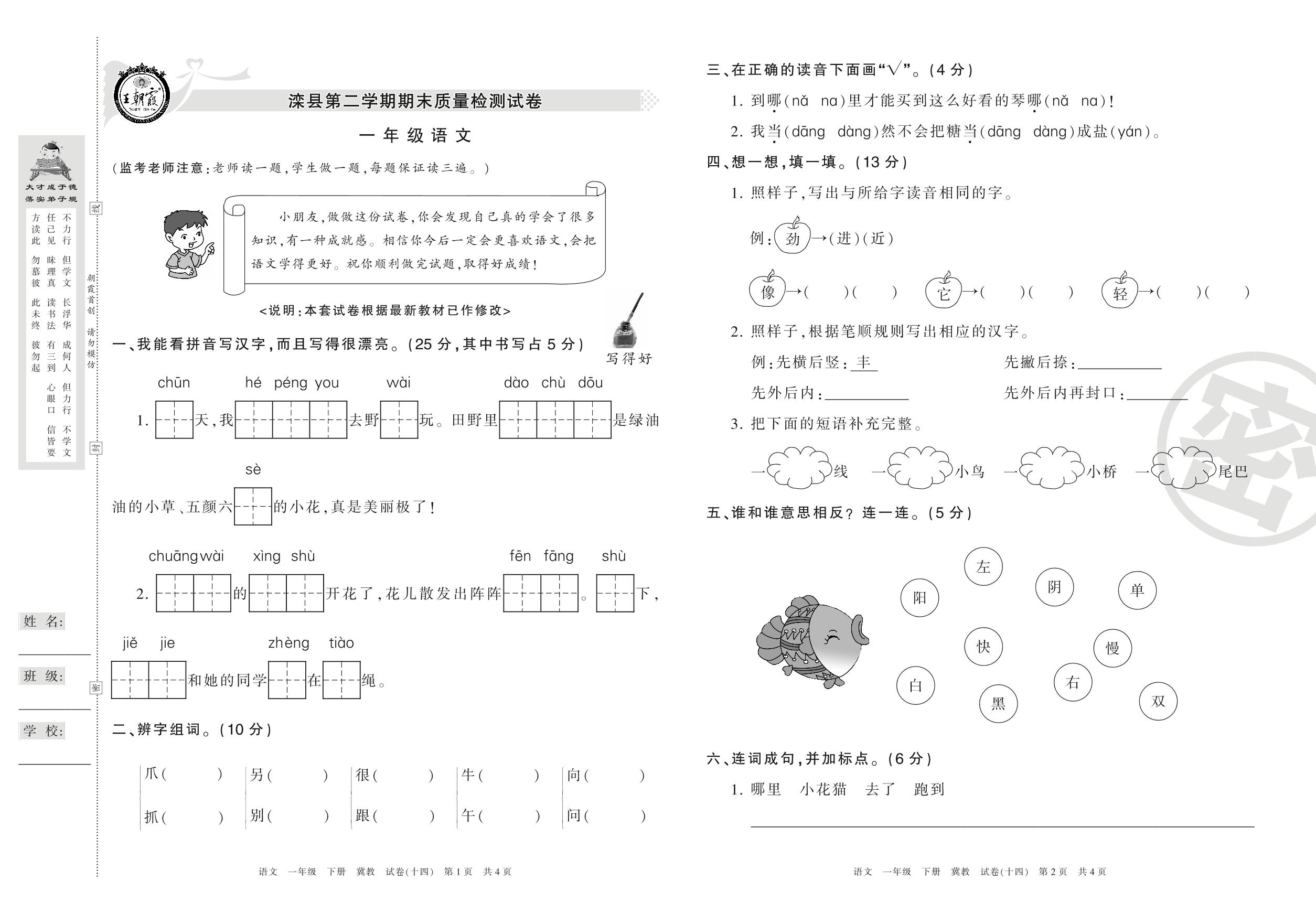 一年级语文冀教版下册期末卷