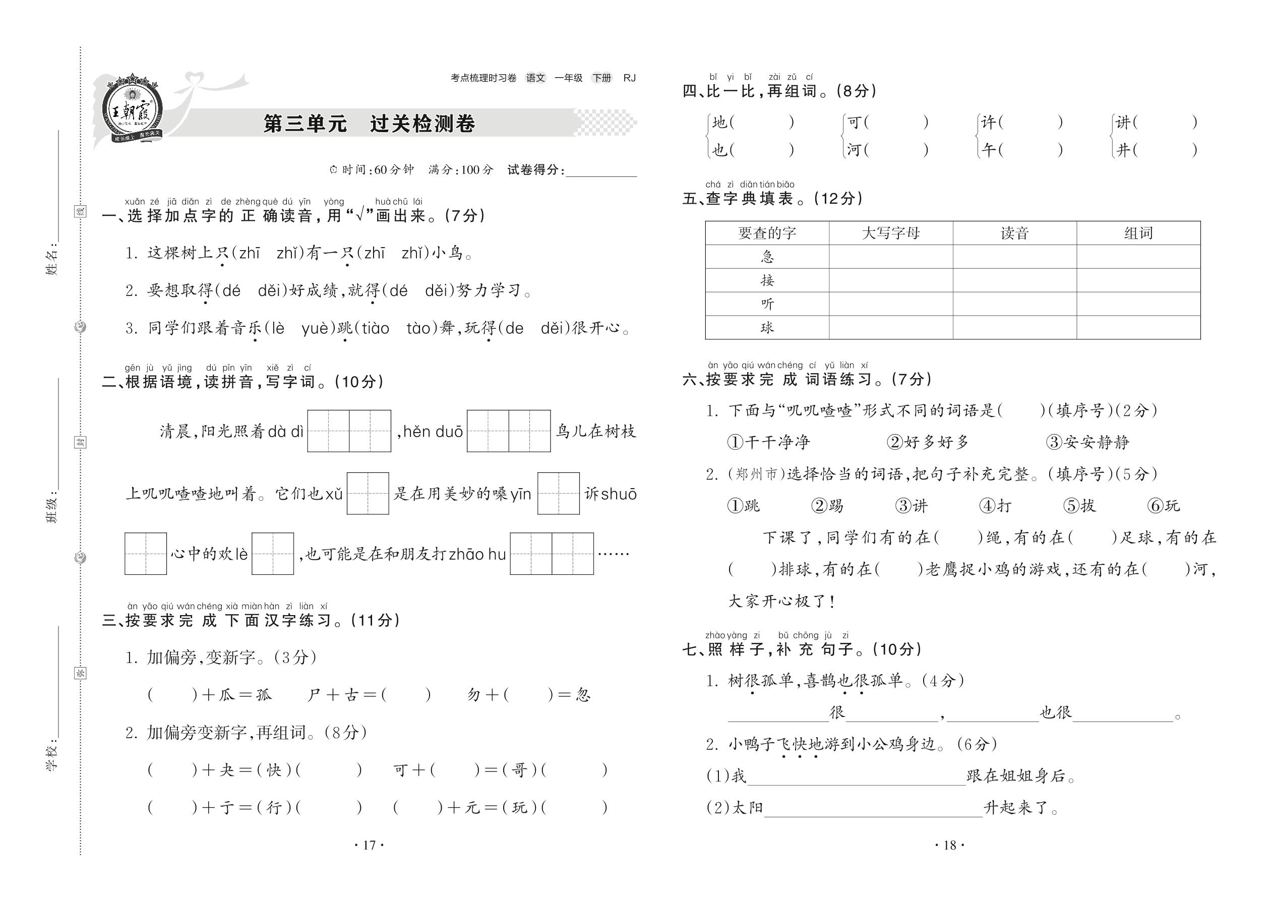 2022下册一年级语文人教版 第三单元 过关检测卷