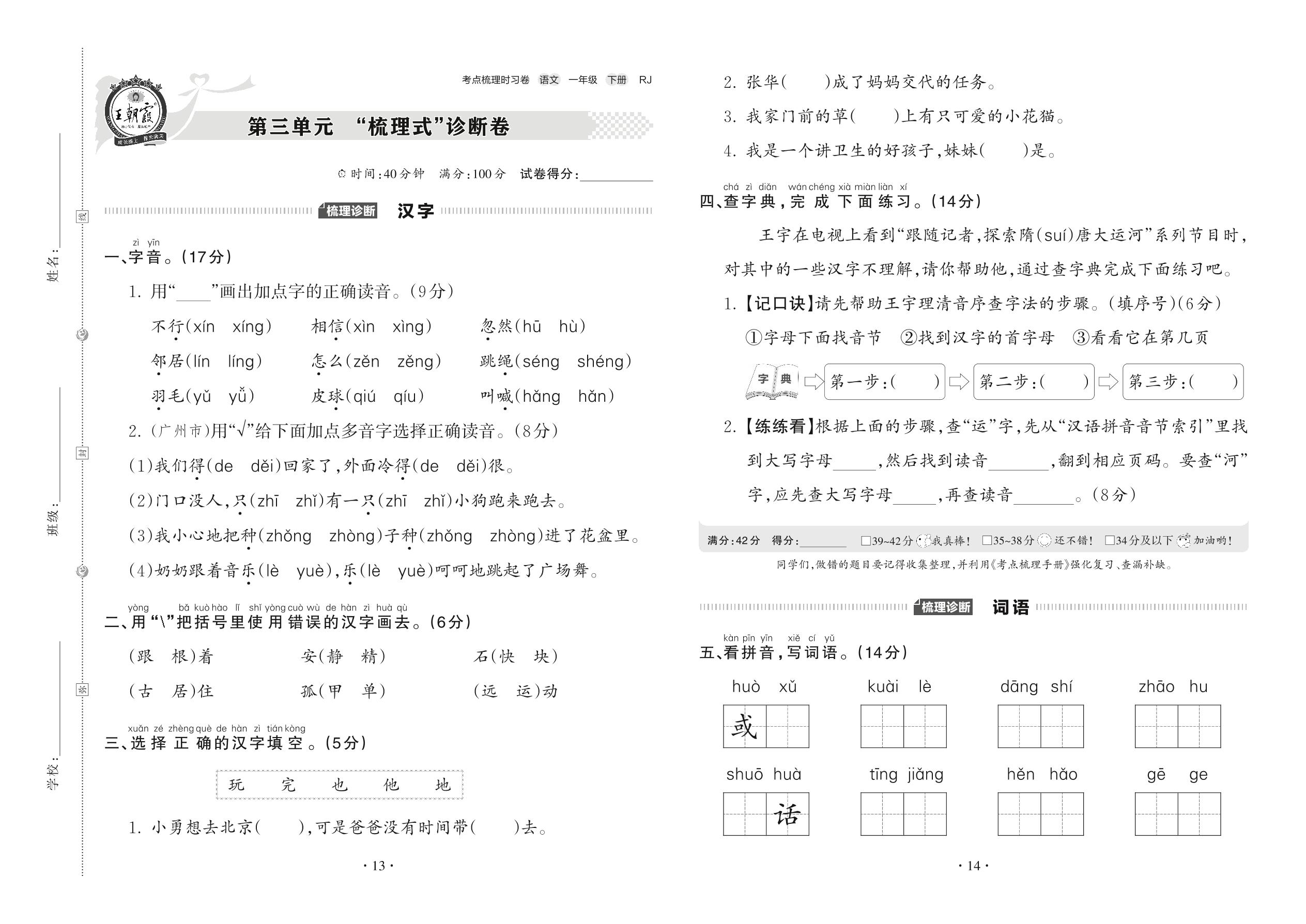 2022下册一年级语文人教版 第三单元 “梳理式”诊断卷