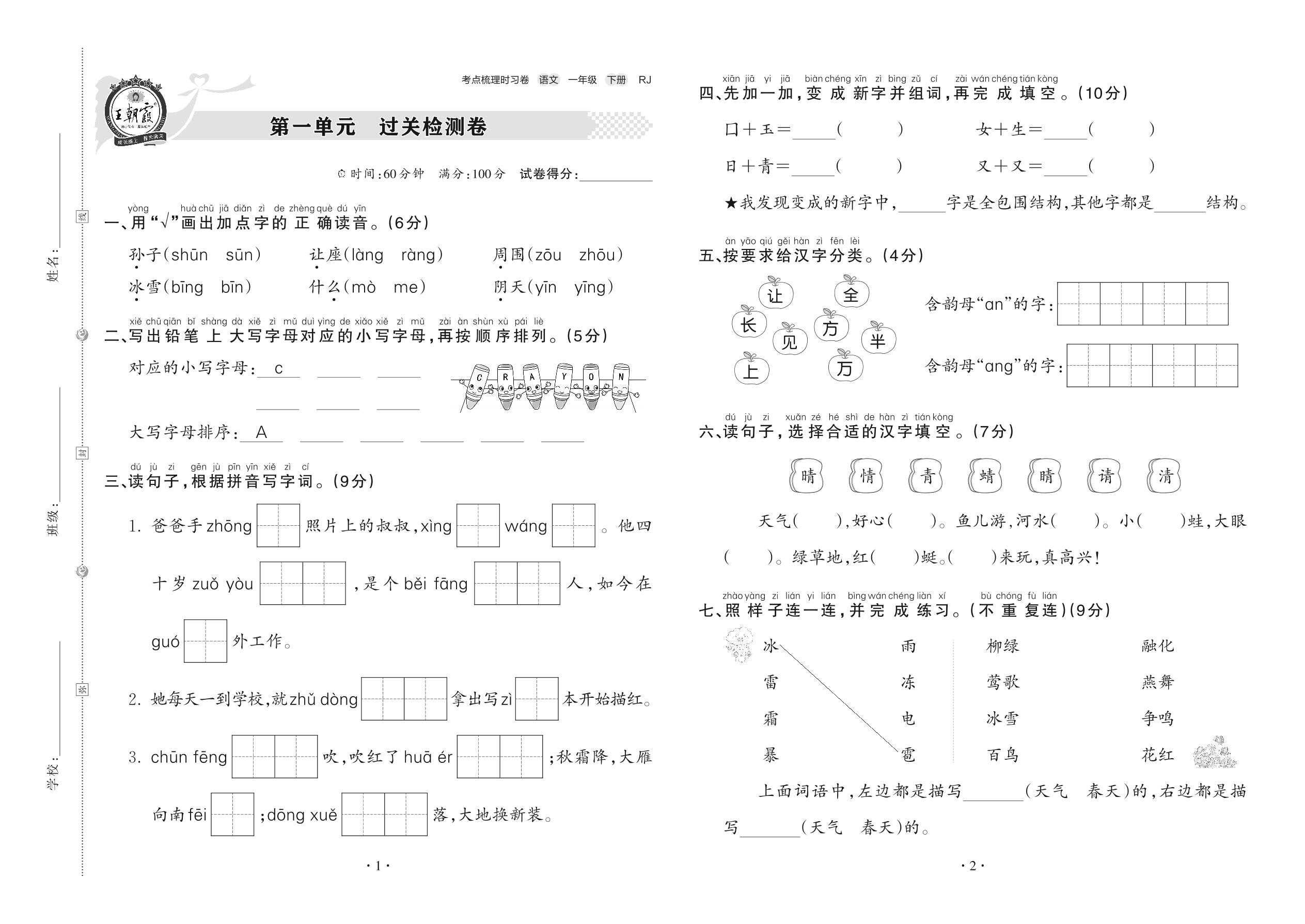 2022下册一年级语文人教版 第一单元 过关检测卷