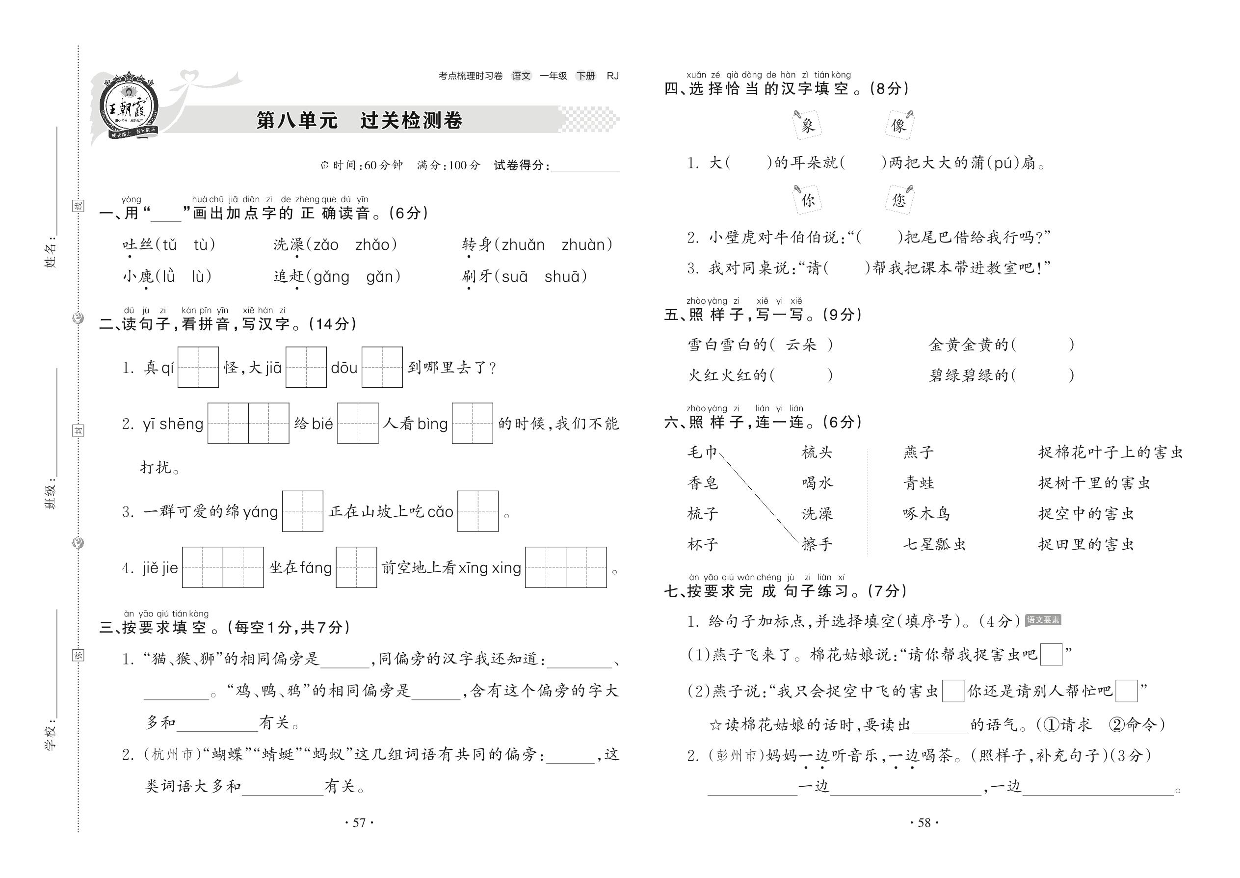 2022下册一年级语文人教版 第八单元 过关检测卷