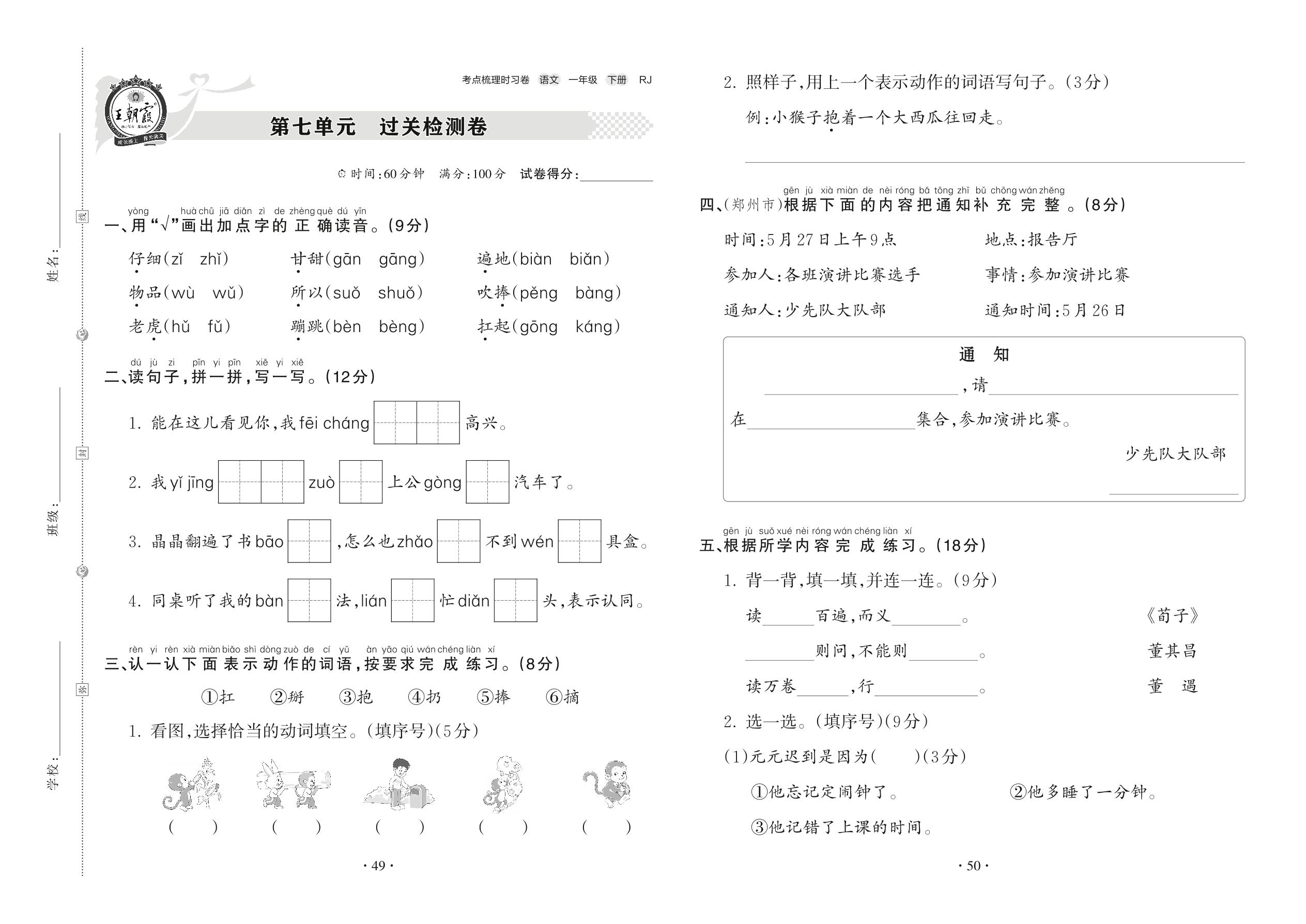 一年级语文人教版下册单元卷