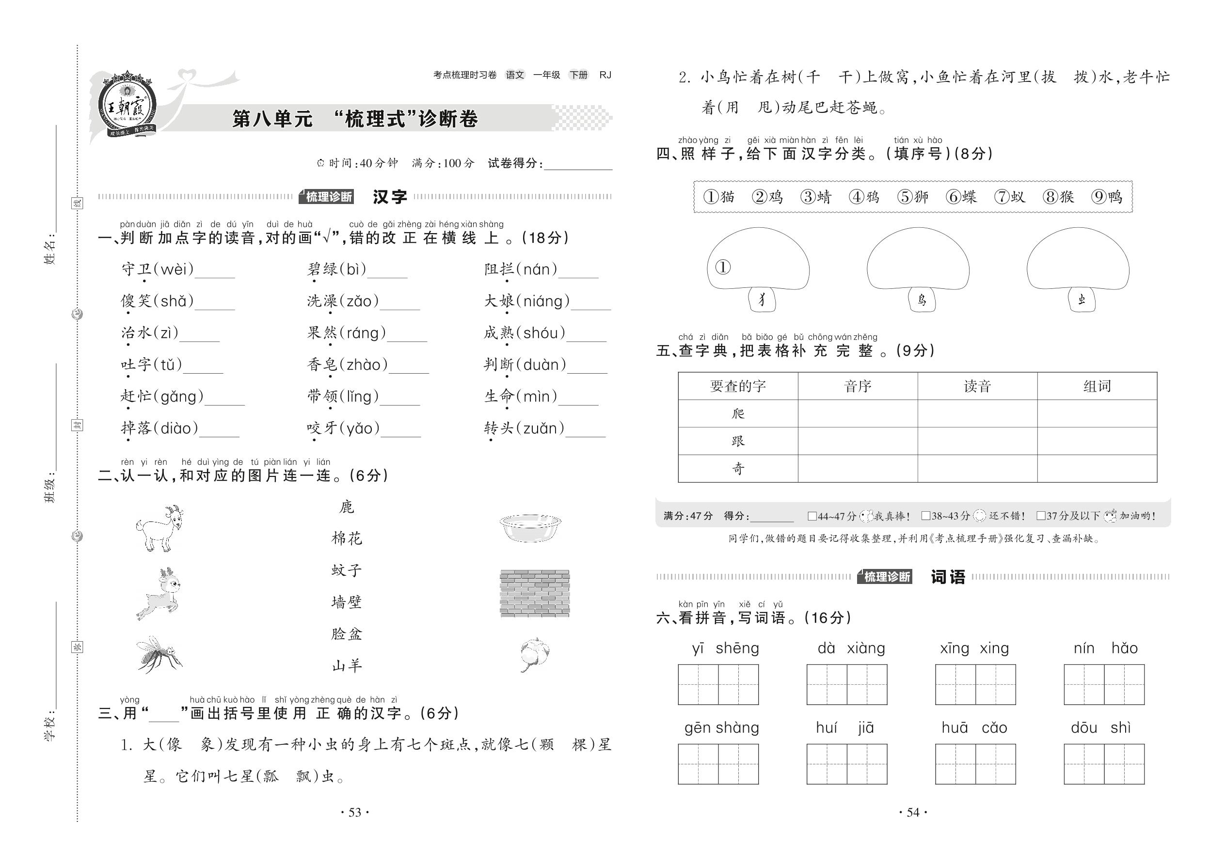 2022下册一年级语文人教版 第八单元 “梳理式”诊断卷