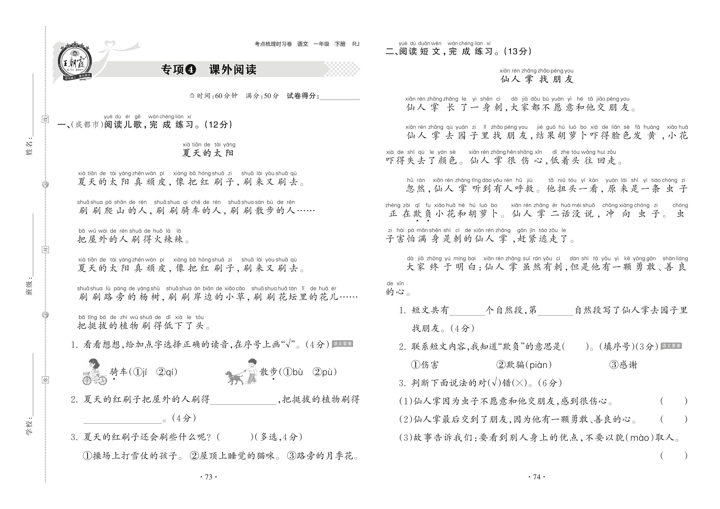 2022下册一年级语文人教版 专项4 课外阅读