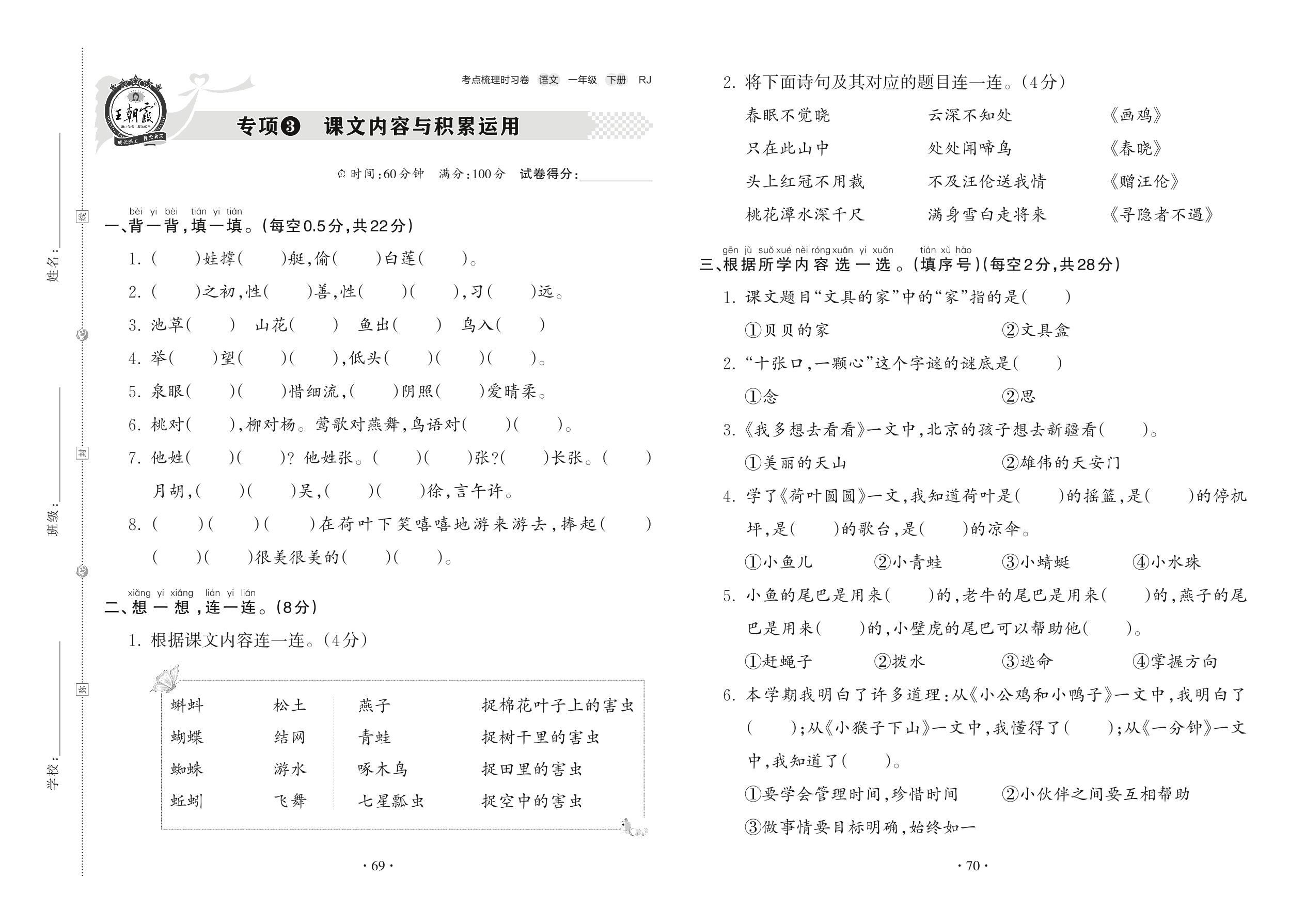 2022下册一年级语文人教版 专项3 课文内容与积累运用