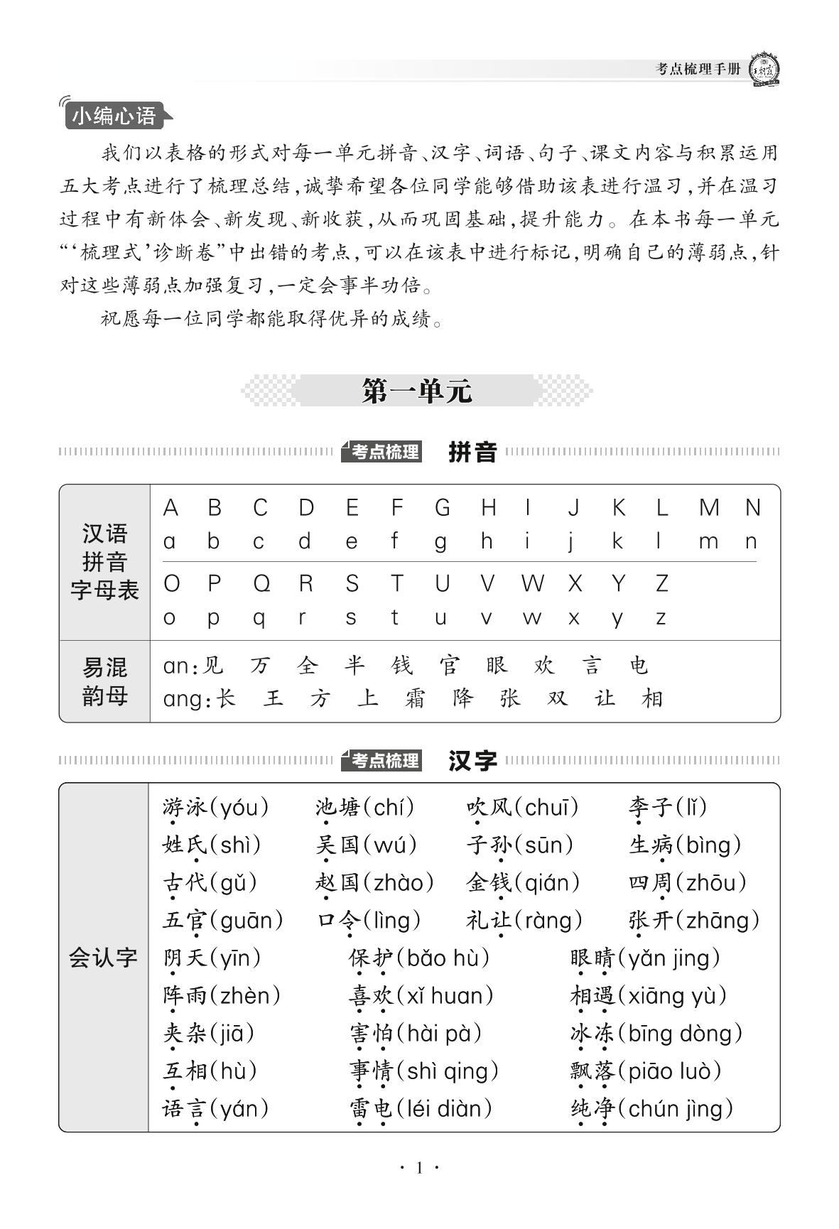 2022下册一年级语文人教版 考点梳理手册——第一单元