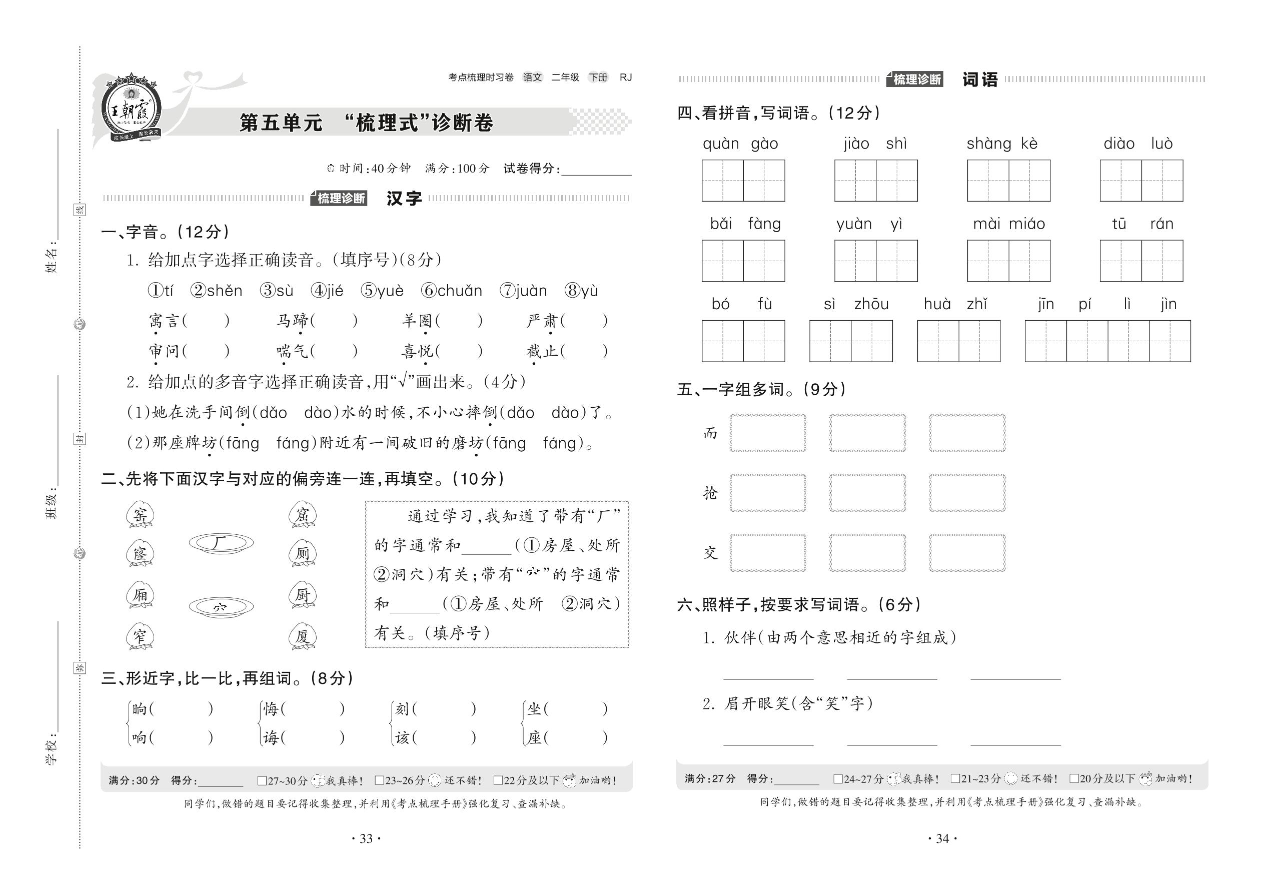 2022下册二年级语文人教版 第五单元 “梳理式”诊断卷