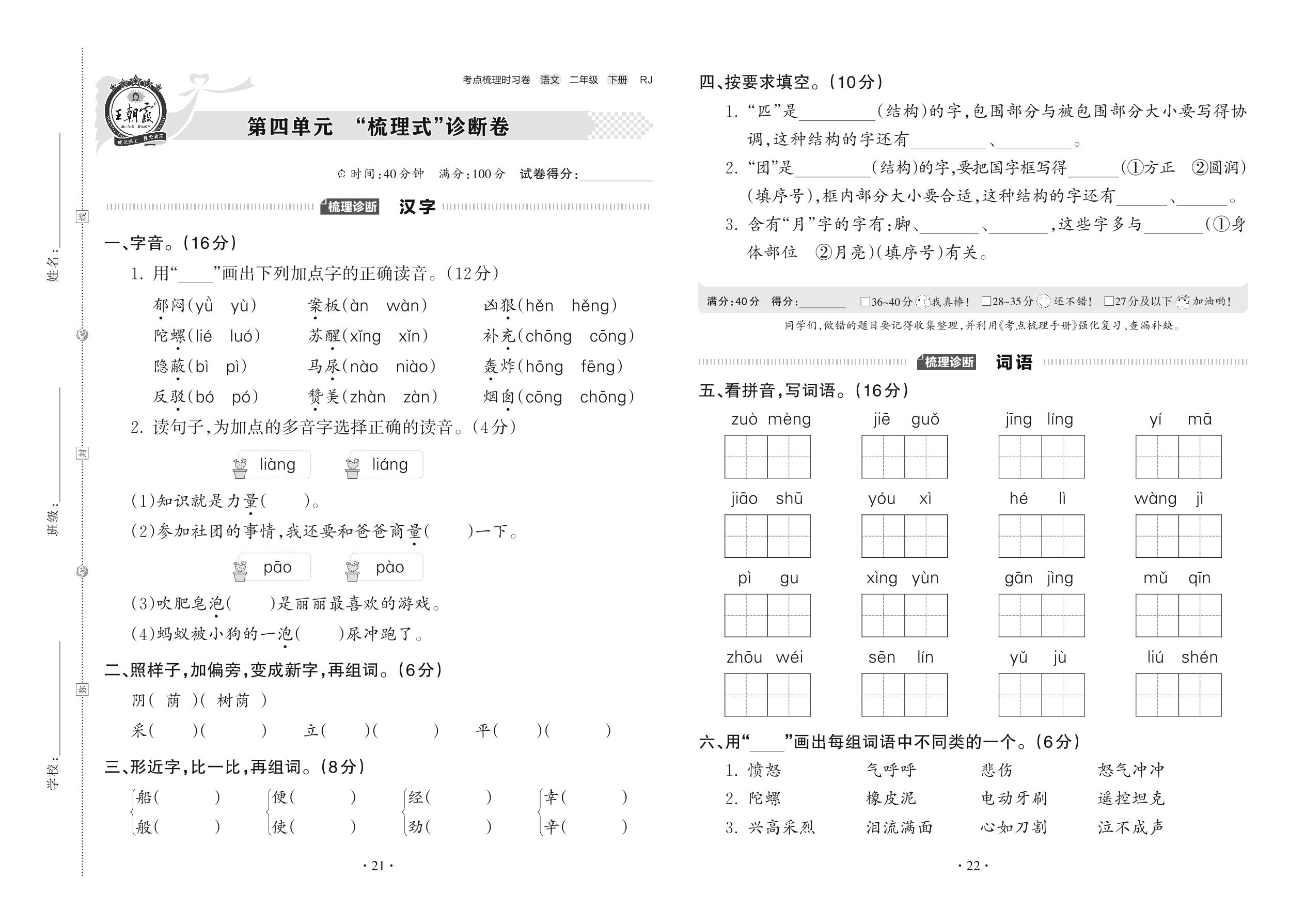 2022下册二年级语文人教版 第四单元 “梳理式”诊断卷