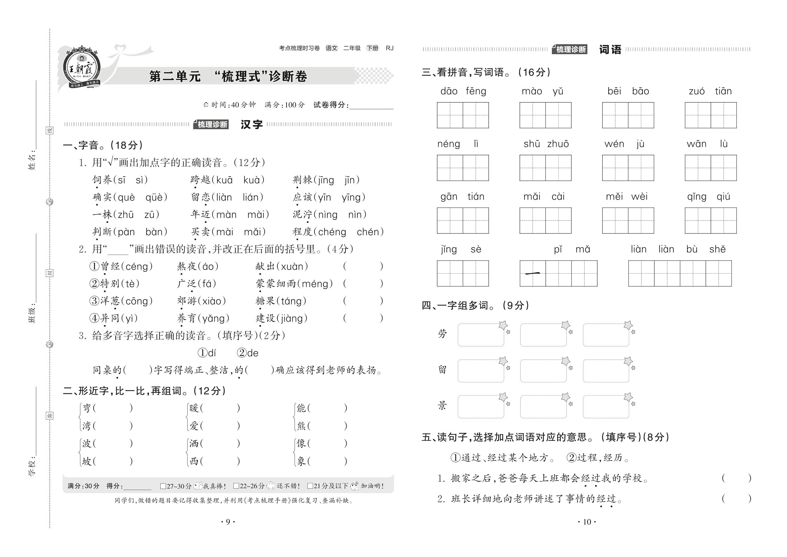 2022下册二年级语文人教版 第二单元 “梳理式”诊断卷