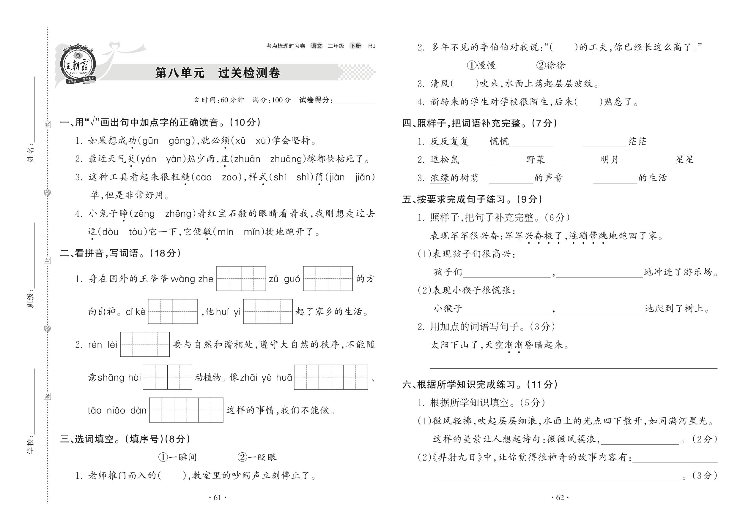 2022下册二年级语文人教版 第八单元 过关检测卷