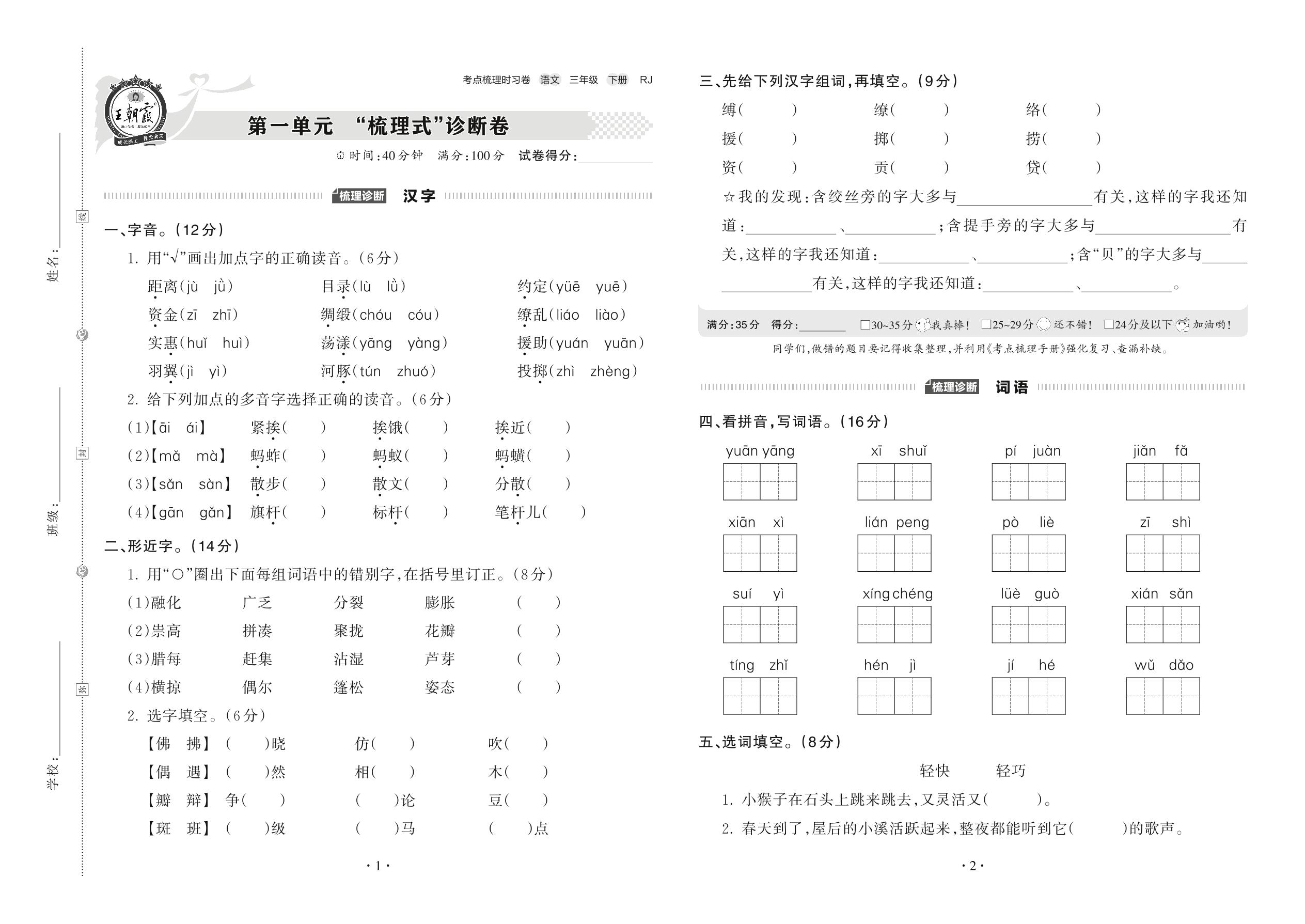 2022下册三年级语文人教版 第一单元 “梳理式”诊断卷