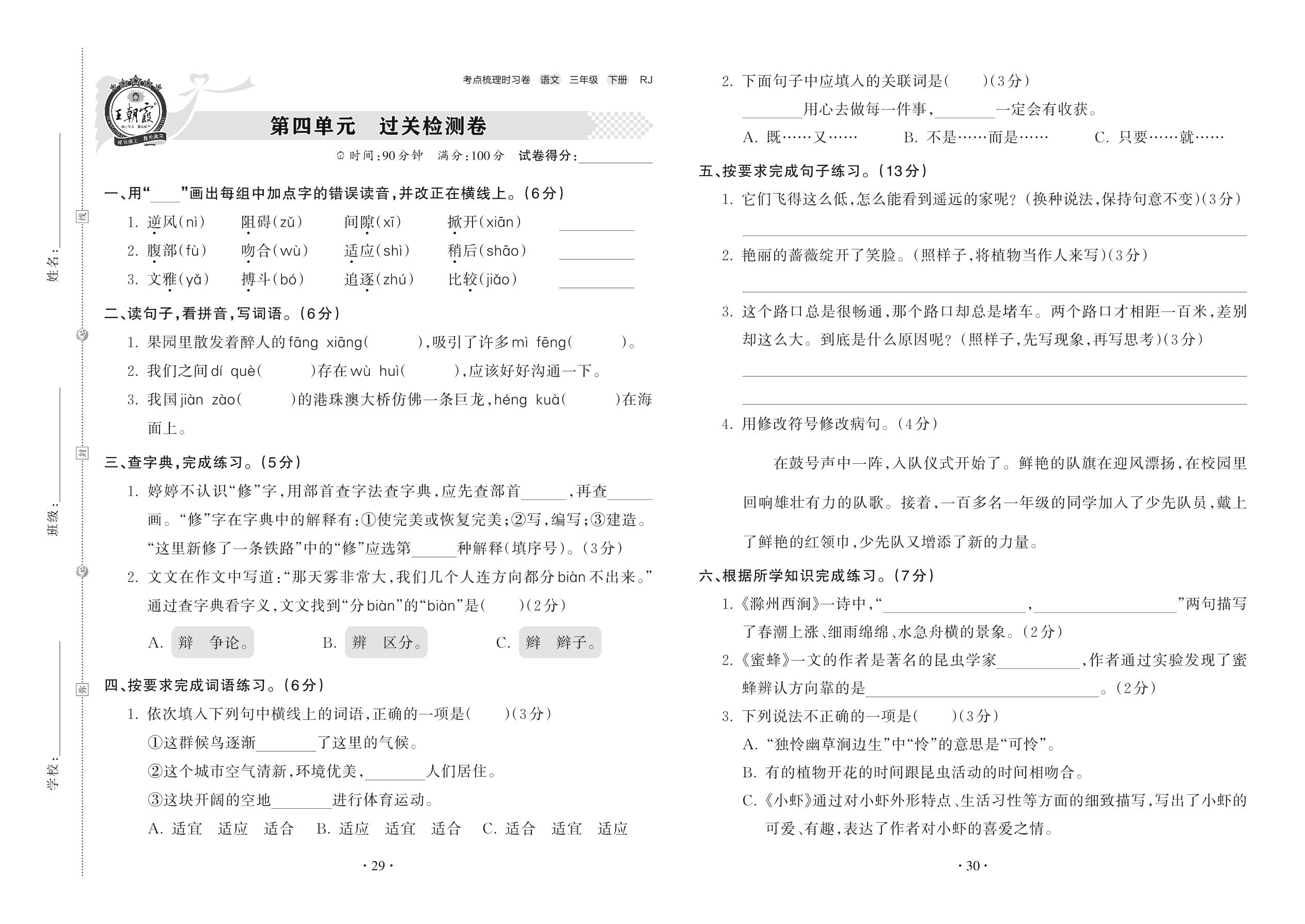 2022下册三年级语文人教版 第四单元 过关检测卷